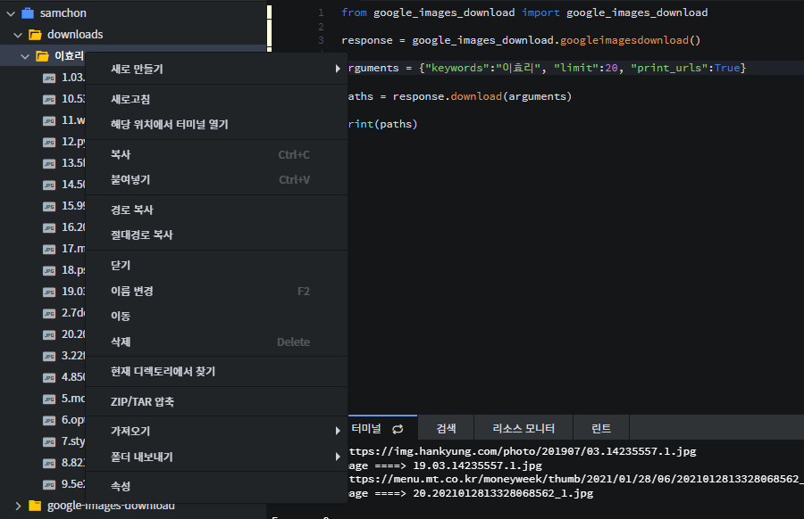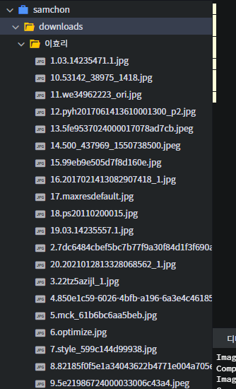 이미지가 다 불러오게되면 1번창에서 다운로드 폴더와 함께 키워드로 적었던 폴더가 생성이 됩니다.