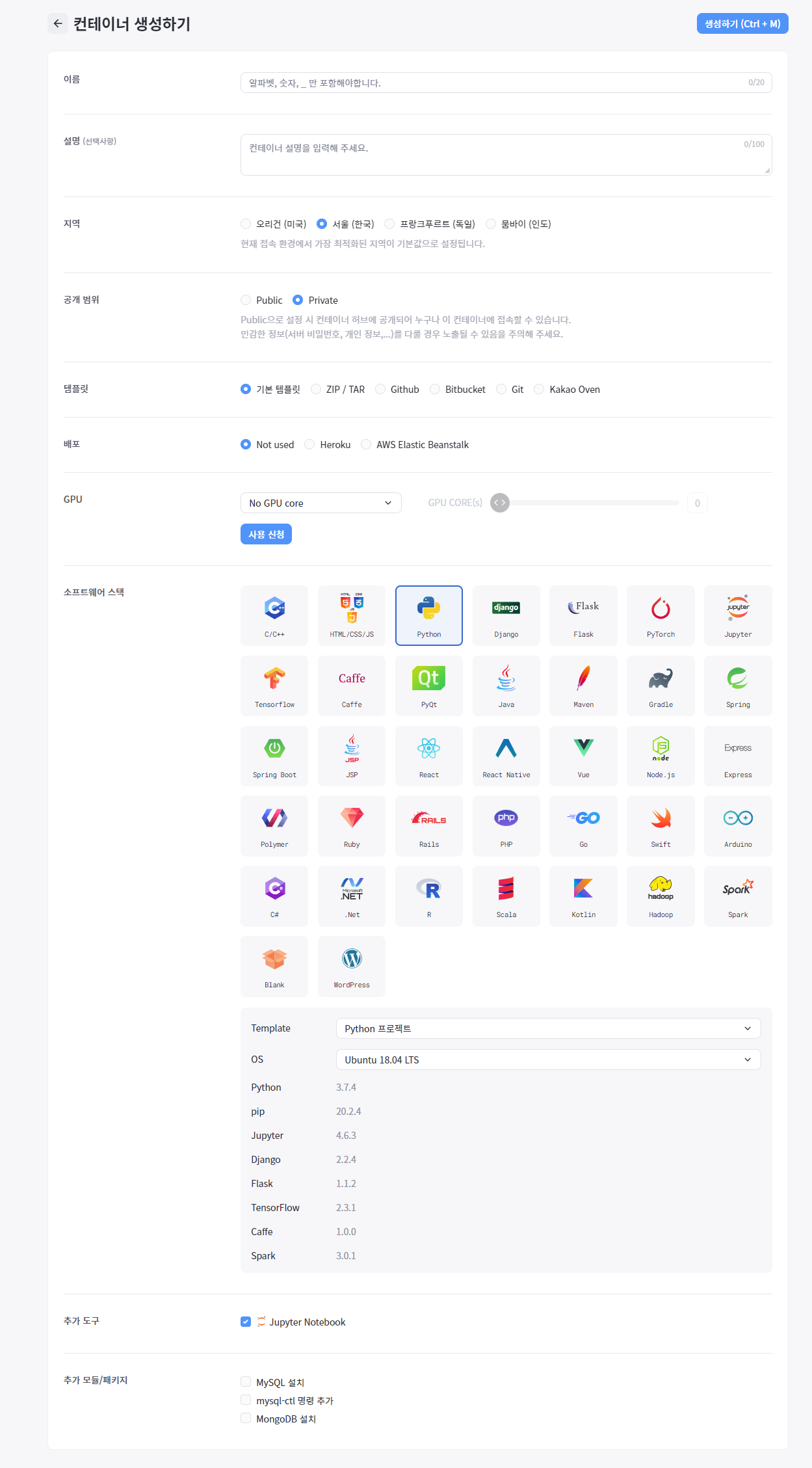 나머지는 그대로 두시고 소프트웨어 스택 에서 'Python ' 을 선택하고 생성하기를 누르시면 됩니다.