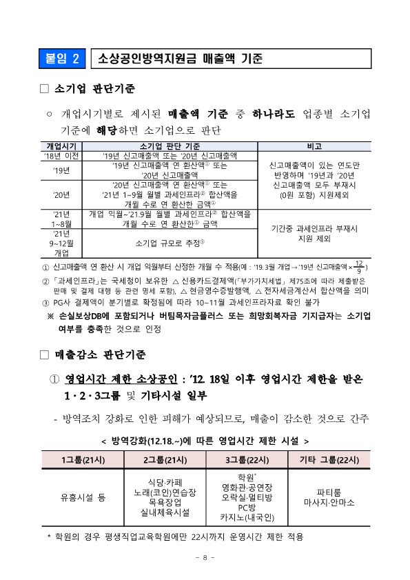 1. 소상공인 방역지원금의 경우 매출액이 소기업(소상공인 포함)에 해당하는 사업체를 지원합니다.