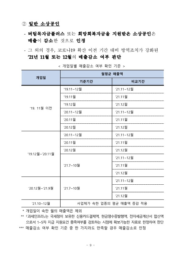 (일반 소상공인) ’21. 12. 18일 이후 영업시간 제한을 받지 않았 으나, 매출이 감소한 것으로 인정되는 소상공인·소기업으로서다음 중 하나에 해당되는 사업체 입니다.