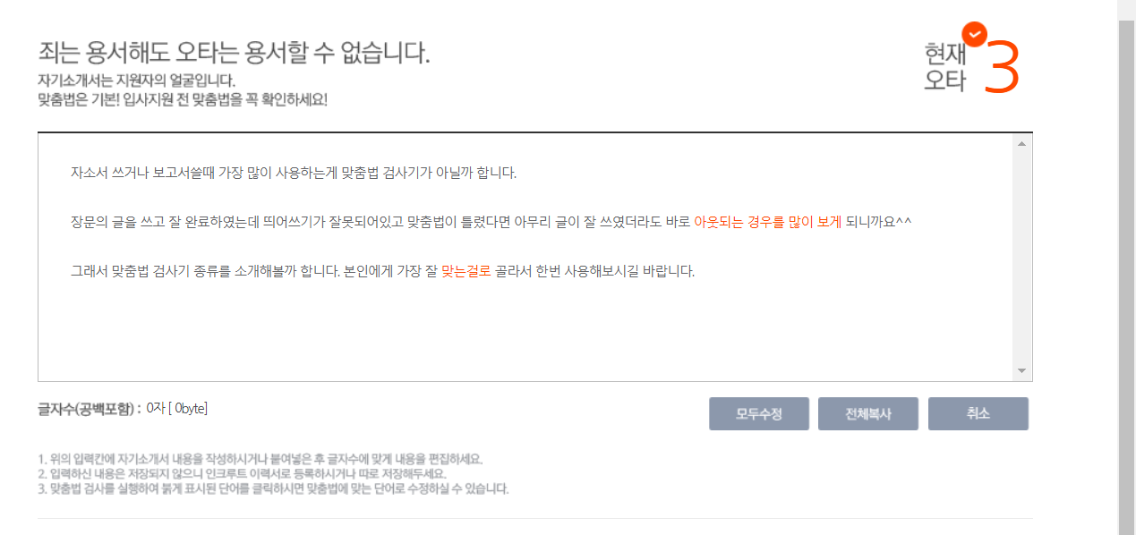 인크루트 맞춤법 검사기는 글자 수 제한이 없고 사진에 보시는 것처럼 현재 오타가 몇 개인지 표기를 해줍니다