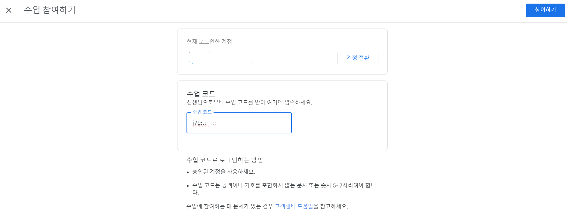 선생님이 보내주신 수업코드를 입력하고 참여하기 버튼을 클릭하시면 해당 수업으로 접속을 할수가 있습니다.