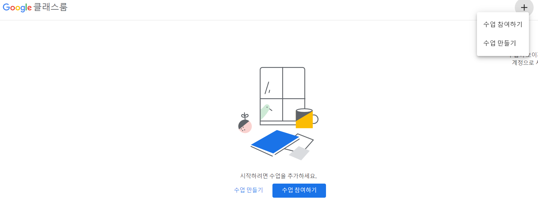 구글클래스룸 처음화면입니다. 화면에는수업만들기와 수업참여하기 버튼이 있습니다ㅏ.
