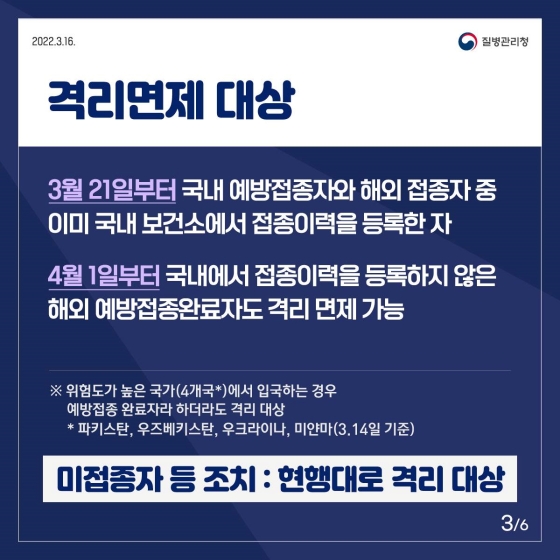 단 위험도가 높은 국가(4개국*)에서 입국하는 경우 예방접종 완료자라 하더라도 격리 대상 이됩니다.