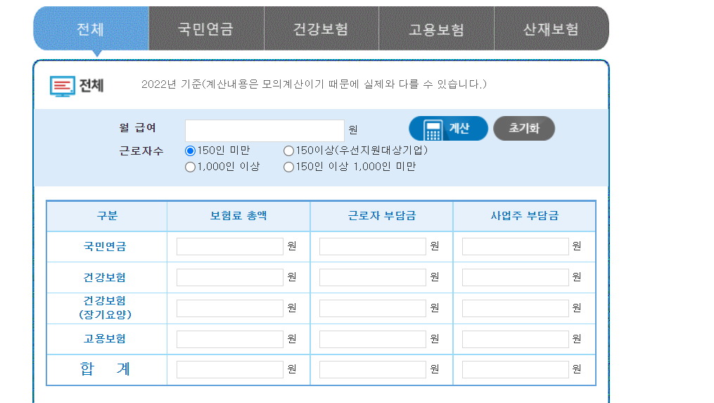 상단 탭 메뉴 국민연금, 건강보험,고용보험,산재보험 클릭하셔서 개별 계산도 가능합니다.