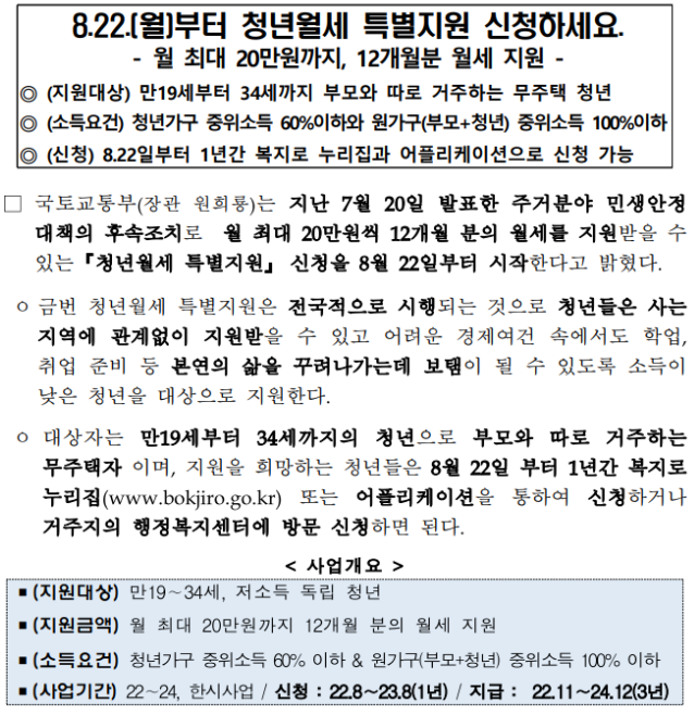8월22일부터 월 최대 20만원 까지 12개월동안 월세를 지원하는 청년월세 특별지원이 시작됩니다.