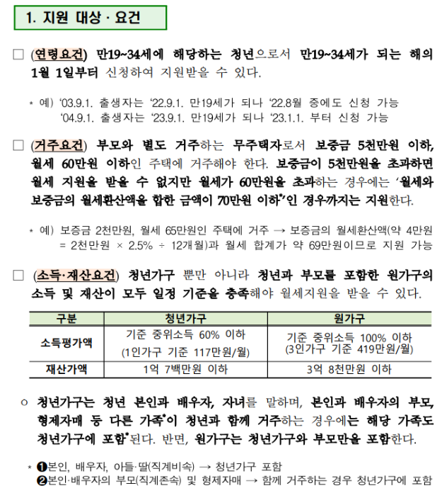 - 부모와 떨어져 별도로 거주하는 만 19세 ~ 만 34세 청년 입니다.