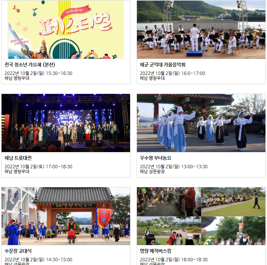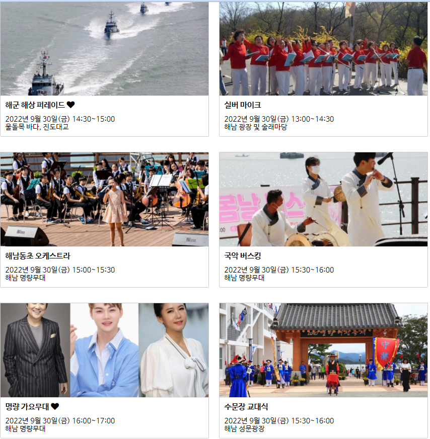 남도굿거리 | 약무호남제례 (진도 정유재란 순절묘역, 해남 우수영 충무사) 14:30~15:00 해군 해경 해상퍼레이드 |
