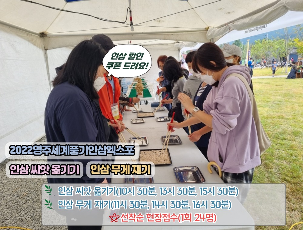 2022영주세계풍기인삼엑스포가 "인삼, 세계를 품고, 미래를 열다!"라는 주제로 2022. 9. 30.일부터 10. 23.일까지 24일간 경상북도 영주시 풍기인삼문화팝업공원 일원에게 개최됩니다. 경상북도 영주시 풍기읍은 고려인삼의 최초 재배지로 알려져 있습니다.