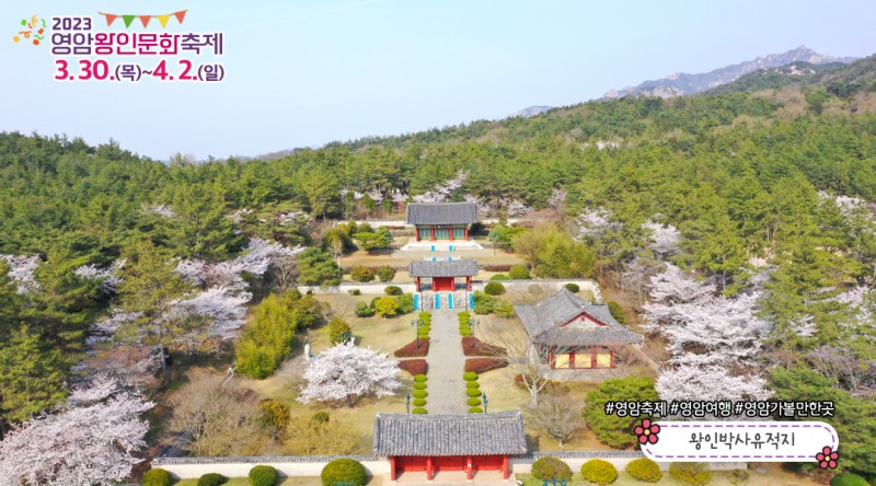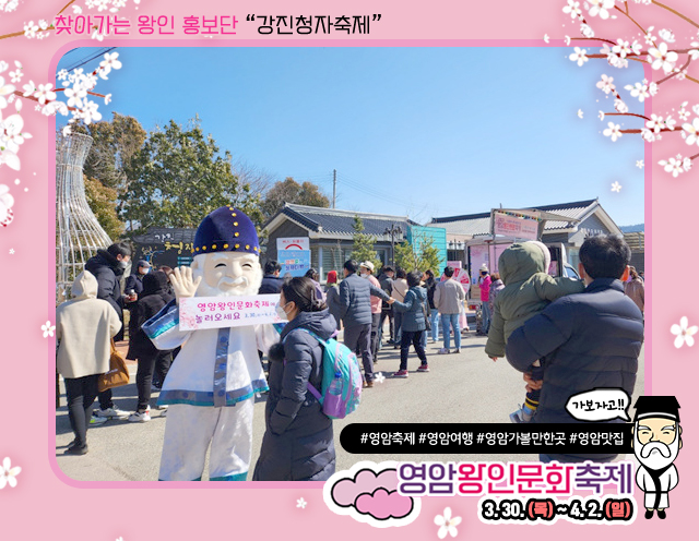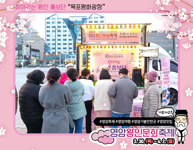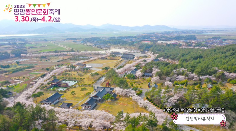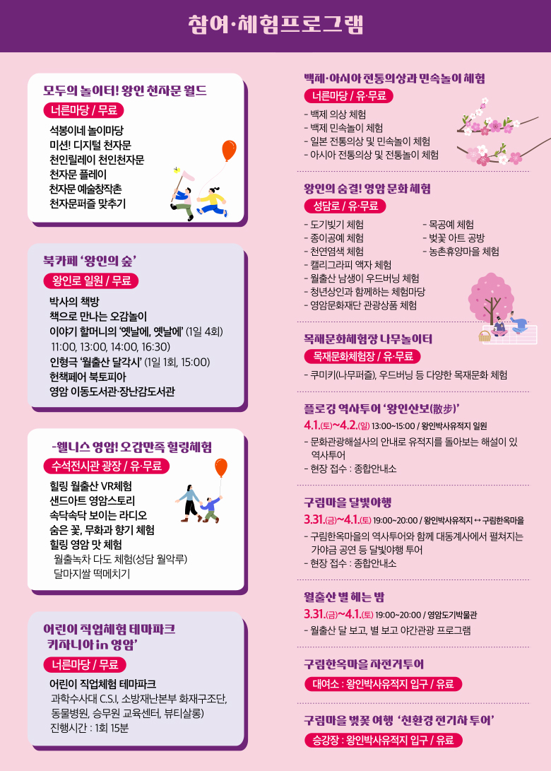 개요 미래 세대를 위한 학습형 놀이 콘텐츠로, 어린이들이 체험과 놀이를 통해 여러가지 직업을 체험할 수 있는 어린이 직업체험 테마파크 일 시 2023. 3. 30.(목)~4. 2.(일) 10:00~18:00 장 소 너른마당 프로그램 ① 과학수사대 C.S.I ② 소방재난본부 화재구조단 ③ 동물병원 ④ 승무원 교육센터 ⑤ 뷰티살롱 백제・아시아 전통의상과 민속놀이 체험 개요 백제와 아시아 문화교류의 장으로, 백제와 일본 등 아시아 주요국가의 전통 복식과 전통 민속놀이 체험 일 시 2023. 3. 30.(목)~4. 2.(일) 장 소 너른마당 프로그램 운영내용 ① 백제 의상 체험 ② 백제 민속놀이 체험 ③ 일본 전통의상 및 민속놀이 체험 ④ 아시아 전통의상 및 민속놀이 체험 왕인의 숨결! 영암 문화 체험 개요 왕인박사가 일본에 전한 백제의 선진문물과 영암 문화 우수성 문화 우수성 홍보를 위한 문화 체험 일 시 2023. 3. 30.(목)~4. 2.(일) 장 소 너른마당, 성담로 프로그램 운영내용 ① 도기빚기 체험 ② 종이공예 체험 ③ 천연염색 체험 ④ 캘리그라피 액자 체험 ⑤ 매화그림 체험 ⑥ 목공예 체험 ⑦ 월출산 남생이 우드버닝 체험 ⑧ 벚꽃 아트 공방 ⑨ 청년상인과 함께하는 체험마당 ⑩ 농촌휴양마을 체험 ⑪ 영암문화관광재단 관광상품 체험 목재문화체험장 나무놀이터 개요 영암목재문화체험장 홍보 및 목재문화에 대한 관심도 제고를 위한 쿠미키(나무퍼즐), 우드버닝 등 나무놀이터 운영 일 시 2023. 3. 30.(목)~4. 2.(일) 장 소 목재문화체험장 상대포 왕인호(백제선) 승선 체험 개요 백제시대 국제무역항이었던 상대포역사공원에서 백제의상 착용 후 왕인호에 승선하여 왕인의 여정을 체감해 보는 포토존 운영 일 시 2023. 3. 30.(목)~4. 2.(일) 장 소 상대포역사공원 상대포 소망연날리기 및 민속놀이 체험 개요 왕인 캐릭터 연 등 여러가지 창작연 시연 및 방문객 참여 소망 연날리기와 민속놀이 체험 운영 일 시 2023. 3. 30.(목)~4. 2.(일) 장 소 상대포역사공원(4일간), 수석전시관 광장(2일간) 봄마중, 구림 벚꽃길 걷기 개요 구림마을 벚꽃길을 걸으며 힐링하는 걷기 체험 일 시 2023. 4. 2.(일) 10:00~11:30 장 소 주무대 구림마을 영암 읍・면 놀이 경연 개요 영암군민 화합의 장으로 마련한 읍 면 화합 레포츠 경연 일 시 2023. 4. 2.(일) 11:30~13:30 장 소 주무대 광장 외국인 미션레이스 헬로 왕인 개요 외국인 대상으로 여러가지 미션을 통해 영암과 왕인을 체감하는 프로그램 일 시 2023. 4. 2.(일) 12:30~16:00 장 소 축제장 일원 플로깅 역사투어 왕인산보(散步) 개요 축제장 내 쓰레기 줍기와 역사투어를 연계한 친환경 줍깅 프로그램으로, 문화관광해설사의 안내로 성천, 왕인박사탄생지, 왕인사당, 왕인학당 등 왕인박사유적지를 돌아보는 해설이 있는 역사투어 일 시 2023. 4. 1.(토)~4. 2.(일) 13:00~15:00 / 2일간 장 소 왕인박사유적지 일원 접수안내 종합안내소 구림마을 달빛야행 개요 문화관광해설사의 안내로 구림마을의 역사투어와 함께 대동계사에서 펼쳐지는 가야금 공연 등 웰니스 영암을 특별하게 즐기는 왕인박사유적지와 구림마을을 연계한 야간 관광 프로그램 일 시 2023. 3. 31.(금)~4. 1.(토) 19:00~20:00 / 2일간 장 소 왕인박사유적지 → 구림마을 접수안내 종합안내소 구림마을 자전거투어 개요 2,200년 역사를 간직한 구림마을을 자전거로 둘러보는 투어 프로그램으로, 웰니스 영암 1번지 영암의 힐링과 쉼 선사 일 시 2023. 3. 30.(목)~4. 2.(일) 장 소 구림마을 승강장 왕인박사유적지 입구 구림마을 벚꽃여행 개요 왕인박사유적지와 상대포역사공원을 연계하는 친환경 전기차 운행 일 시 2023. 3. 30.(목)~4. 2.(일) / 10:00~17:30 장 소 왕인박사유적지 영암도기박물관 승강장 왕인박사유적지 입구, 영암도기박물관 입구(회사정) AR(증강현실)로 즐기는 왕인의길 다섯마당 개요 왕인의 탄생부터 학문수학, 오경박사 등용, 초빙 및 도일 등 왕인박사 AR 앱을 이용해서 왕인의 길을 체감하는 AR(증강현실) 왕인 콘텐츠 체험 일 시 2023. 3. 30.(목)~4. 2.(일) 장 소 왕인박사유적지, 상대포역사공원 봄꽃 사진관 개요 축제장에서 촬영한 스마트폰 사진을 즉석 인화해서 제공하는 추억 서비스 일 시 2023. 3. 30.(목)~4. 2.(일) 장 소 성담로 월출산 별 헤는 밤 개요 축제장 야간관광 활성화 프로그램으로, 월출산 달 보기, 별 보기 체험 일 시 2023. 3. 31.(금)~4. 1.(토) 19:00~20:00 장 소 영암도기박물관 구석구석 미션투어 개요 축제장 전역 활성화를 위한 온・오프라인 프로그램으로, 축제장과 주요 관광지 방문 미션을 통해 완수상품을 증정하는 투어 프로그램 일 시 2023. 3. 30.(목)~4. 2.(일) 장 소 축제장 일원 프로그램 운영내용 ① 영암여행토퍼 인증샷 랠리 ② 구림마을 모바일 스탬프투어