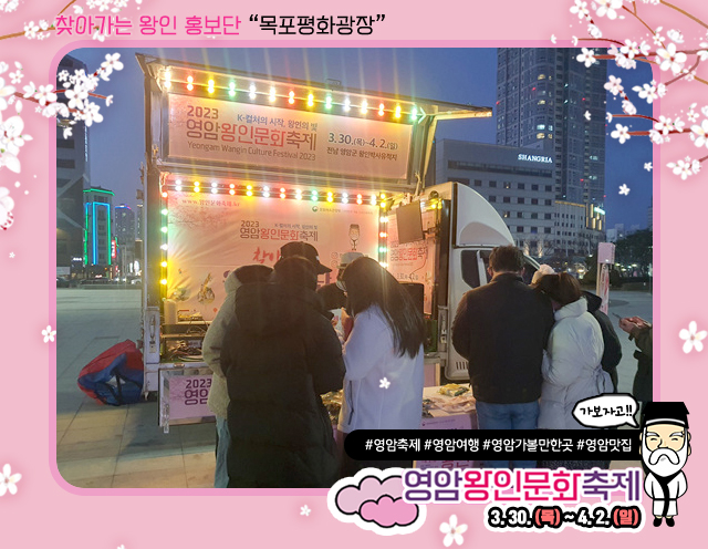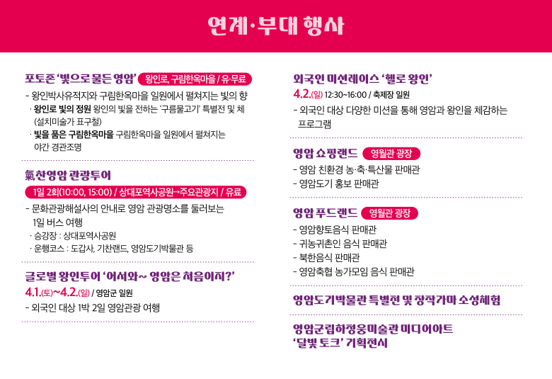 접수안내 종합안내소 봄꽃 소식, 느린 우체통 개요 축제장에서 작성한 엽서를 1년 후 발송해 주는 타임머신 우체통 일 시 2023. 3. 30.(목)~4. 2.(일) 장 소 왕인로 연계부대행사 氣찬영암 관광투어 개요 문화관광해설사의 안내로 영암 관광명소를 둘러보는 1일 버스여행 일 시 2023. 3. 30.(목)~4. 2.(일) 10:00, 15:00 / 1일 2회 장 소 상대포역사공원 → 주요 관광지 프로그램 운영내용 투어코스 : 상대포역사공원(출발) → 월출산도갑사 → 기찬랜드 → 상대포역사공원 → 영암도기박물관 → 영암군립하정웅미술관 → 영암군립하정웅미술관 창작교육관 투어시간 : 2~3시간 참가인원 : 1회 25명(접수순) ☞ 장애인, 영유아 : 보호자 동반 고지 운행횟수 : 1일 2회(1대 운영) 출발시간 : 10:00 / 15:00 운행요금 : 1,000원 탑승장소 : 상대포역사공원 승강장 참가접수 : 현장접수(상대포역사공원 관광안내소) 투어일정 소요 내용 비고 10' 참가자 집결 및 차량 이동 : 상대포역사공원 → 월출산도갑사 20' 월출산 도갑사 관람 10' 차량 이동 : 월출산도갑사 → 기찬랜드 20' 기찬랜드 관람 20' 차량 이동 : 기찬랜드 → 상대포역사공원 5' 도보 이동 : 상대포역사공원 → 영암도기박물관 10' 영암도기박물관 관람 5' 도보 이동 : 영암도기박물관 → 영암군립하정웅미술관 10' 영암군립하정웅미술관 관람 5' 도보 이동 : 영암군립하정웅미술관 → 창작교육관 10' 영암군립하정웅미술관 창작교육관 관람 글로벌 왕인투어 어서와~ 영암은 처음이지? 개요 외국인 대상 1박 2일 체류형 콘텐츠로, 영암의 주요 명소와 축제의 여러가지 프로그램을 직접 만나는 영암관광 여행 일 시 2023. 4. 1.(토)~4. 2.(일) / 2일간 장 소 영암군 일원 프로그램 운영내용 국내외 외국인들이 영암의 주요 명소 관광과 축제 프로그램 참여를 통해 영암과 왕인을 체감 참가대상 : 국내・외 거주 외국인 구림마을 한옥스테이 개요 2,200년 역사와 전통의 구림마을에서 한옥의 정취와 전통을 체험하는 1박 2일 체류형 전통문화 체험프로그램 일 시 2023. 3. 30.(목)~4. 2.(일) / 상설 장 소 구림마을 프로그램 운영내용 구림마을 워킹투어 : 구림・죽정 12정자 및 종가(宗家) 탐방 등 문화체험 : 전통 놀이마당 등 축제 체험행사와 연계 운영 전통가옥 민박체험 : 구림마을 내 한옥 민박체험 축제장 내 영암 쇼핑랜드 방문 참가접수 : 전화를 통한 사전접수 및 현장접수 참 가 비 : 유료 월출산도갑사 템플스테이 개요 천년고찰 도갑사에서 운영하는 사찰문화 체험프로그램 일 시 2023. 3. 30.(목)~4. 2.(일) / 상설 장 소 월출산도갑사 프로그램 운영내용 상시 자율휴식형 나 그냥 쉴래요. 월출산에 푹 안겨서! : 오리엔테이션, 저녁식사(공양), 저녁 예불 등 참가접수 : 사전접수 및 현장접수 참 가 비 : 유료 진행순서 구분 시간 내용 비고 1일차 15:00~16:00 도착 및 방사 안내 16:00~17:00 사찰예절 및 안내 17:00~17:20 저녁 공양 18:30~19:00 저녁 예불(자율) 19:00~20:40 자유시간 20:40~21:00 세면 후 취침 2일차 05:00~05:30 아침예불(자율) 07:00~07:20 아침공양 07:30~09:00 자율휴식 09:30~10:00 방사 정리 후 퇴실 영암도기박물관 특별전 및 장작가마 소성체험 개요 영암왕인문화축제를 맞이해서 도기박물관 특별 기획전 및 도기빚기 등 체험 운영으로 시유도기의 발상지인 구림의 전통과 영암도기의 우수성 홍보 일 시 2023. 3. 30.(목)~4. 2.(일) / 상설 장 소 영암도기박물관 프로그램 운영내용 ① 영암도기 특별전 <도자, 그림을 그리다> 내용 : 3차원의 도자기를 캔버스로 활용한 경우 혹은 회화적 특성을 융합한 현대도예가의 작품 전시 기간 : 3. 30.(목)~9. 30.(토) 장소 : 영암도기박물관 2층 기획전시실 ② 장작가마 소성체험 내용 : 월출의 달을 굽다, 장작가마 불멍, 소원성취 장작 태우기 기간 : 3. 31.(금)~4. 2.(일) 장소 : 영암도기박물관 장작가마 영암요 영암군립하정웅미술관 미디어아트 달빛 토크 기획전시 개요 영암군립하정웅미술관 미디어아트 특별 기획전 운영 일 시 2023. 3. 30.(목)~4. 30.(일) / 상설 장 소 영암군립하정웅미술관 프로그램 상설전시실 : 왕인을 테마로 사월의 봄밤, 벚꽃과 미디어 파사드 전시 기획전시실 : 월출산을 테마로 한 몰입형 전시 창작교육관 소장품 공개전 : 노다노리오 심상풍경전(3. 30.~9. 17.), 영암의 화가들(3. 30.~) 포토존 빛으로 물든 영암 개요 왕박사유적지를 다채로운 한지등으로 밝혀 왕인의 빛을 표현한 작품 전시와 구림마을 경관 조명 설치로 야간 볼거리 제공 일 시 2023. 3. 25.(토)~4. 9.(일) 장 소 왕인박사유적지, 구림마을 프로그램 전시구성 ① 왕인로 빛의 정원 내용 : 왕인의 빛을 전하는 구름물고기 특별전 및 체험 기간 : 3. 25.(토)~4. 9.(일) 체험(유료) : 한지조명등 체험 ② 빛을 품은 구림마을 내용 : 구림마을 일원에 펼쳐지는 야간 경관조명 기간 : 3. 25.(토)~4. 9.(일) 장소 : 구림마을 일원 영암 홍보관 개요 영암의 우수 역사・문화・관광 자원을 활용한 콘텐츠 발굴과 영암의 주요 정책, 자원과 연계한 홍보관 운영 일 시 2023. 3. 30.(목)~4. 2.(일) 장 소 영월관 광장 프로그램 운영내용 ① 월출산국립공원 생태탐방원 영암 유치 홍보관 ② 월출산국립공원 및 큰바위얼굴 홍보관 월출산국립공원 홍보관 월출산국립공원 큰바위