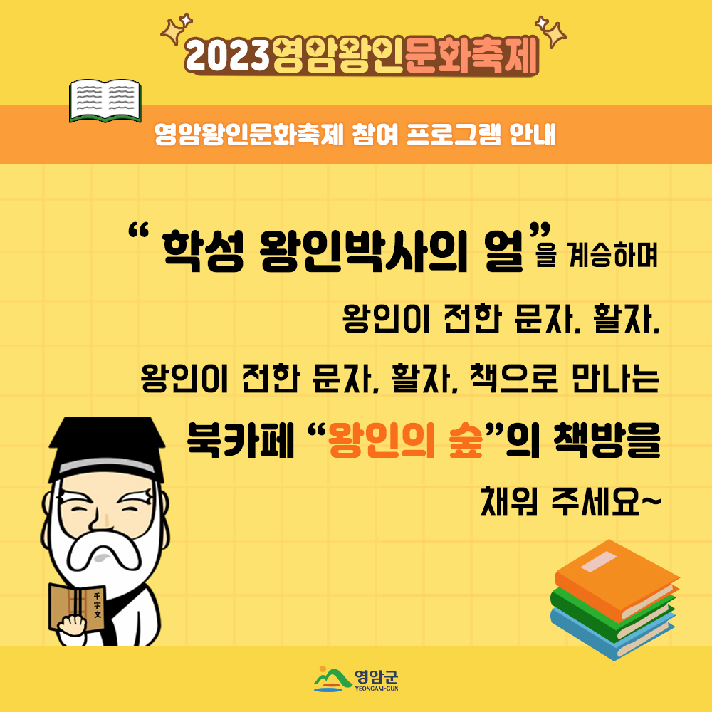 성향예술단 전통문화공연 개요 영암의 국악인들로 구성된 전문예술단이 펼치는 판굿, 25현 가야금병창 등 국악 공연 일 시 2023. 4. 2.(일) 16:00~17:00 장 소 주무대 폐막 식전공연 & 폐막행사 구림의 밤 개요 축제의 성공 개최를 자축하고 군민들의 노고를 위무하고 격려하는 맺음 마당 일 시 2023. 4. 2.(일) 17:30~20:30 장 소 주무대 출연진 김성환, 박정식, 현진우, 박형호, 김나희 캐릭터퍼포먼스 왕인과 친구들 개요 축제장 곳곳에서 펼쳐지는 왕인과 친구들의 캐릭터퍼포먼스와 방문객 포토타임 진행 일 시 2023. 3. 30.(목)~4. 2.(일) 장 소 축제장 일원 왕인愛 몹플레이 개요 축제장 곳곳에서 산발적으로 펼쳐지는 영암댄스팀의 플래시몹 공연 일 시 2023. 4. 1.(토)~4. 2.(일) / 1일 3회 장 소 축제장 일원 참여체험행사 모두의 놀이터! 왕인 천자문 월드 개요 왕인의 상징 천자문 과 영암의 한석봉 설화를 놀이로 즐기는 프로그램 일 시 2023. 3. 30.(목)~4. 2.(일) 장 소 너른마당 프로그램 운영내용 ① 석봉이네 놀이마당 ② 미션! 디지털 천자문 ③ 천인릴레이 천인천자문 ④ 천자문 플레이 ⑤ 천자문 예술창작촌 ⑥ 천자문 퍼즐 맞추기 북카페 왕인의 숲 개요 학성 왕인박사의 얼을 계승하며 왕인이 전한 문자, 활자, 책을 활용한 콘텐츠로, 왕인, 천자문 등을 책과 이야기, 인형극으로 배우고 즐기는 야외 북카페 운영 일 시 2023. 3. 30.(목)~4. 2.(일) 장 소 왕인로 일원 프로그램운영내용 ① 박사의 책방 ② 책으로 만난 오감놀이 ③ 이야기 할머니의 옛날에, 옛날에 / 11:00, 13:00, 14:00, 16:30(1일 4회) ④ 인형극 월출산 달각시 / 15:00~15:50(1일 1회) ⑤ 헌책페어 북토피아 ⑥ 영암 이동도서관 장난감도서관 K-웰니스 영암! 오감만족 힐링 체험 개요 대한민국 대표 웰니스산업 특화도시, 영암을 오감으로 즐기는 힐링 콘텐츠 일 시 2023. 3. 30.(목)~4. 2.(일) 장 소 수석전시관 광장 프로그램 운영내용 ① 힐링 월출산 VR체험 ② 샌드아트 영암스토리 ③ 속닥속닥 보이는 라디오 ④ 숨은 꽃, 무화과 향기 체험 ⑤ 힐링 영암 맛 체험 월출녹차 다도체험 ⑥ 힐링 영암 맛 체험 달마지쌀 떡메치기 어린이 직업체험 테마파크 키자니아 in 영암