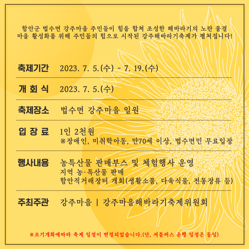함안군 법수면 강주마을 주민들이 힘을 합쳐 자체적으로 조성한 해바라기 꽃이 장관을 이루는 강주해바라기 축제가 올해로 11회째를 맞는다. 전체 해바라기 식재면적은 법수면 강주리 주변 37,000㎡에 이르며 전통과 문화를 부흥시켜 보자는 취지로 마을마다 지닌 끼를 모아 축제 한마당도 함께 펼쳐진다.