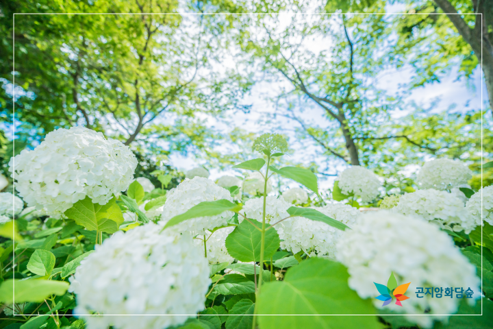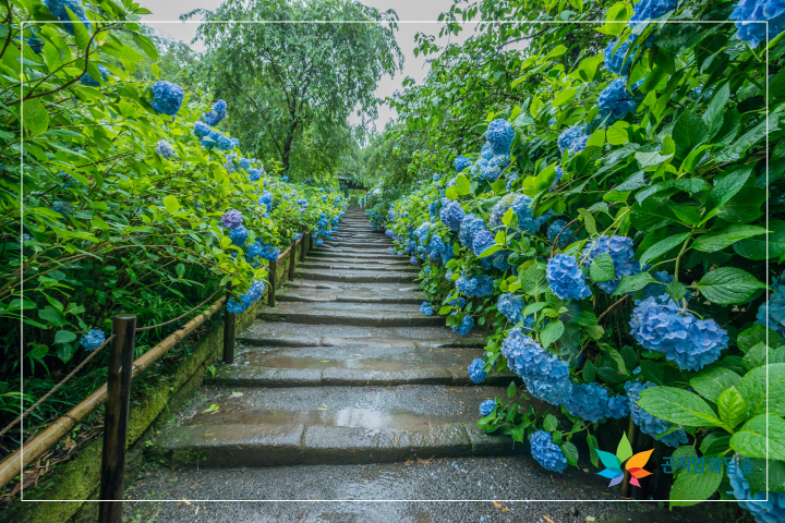 7만여 그루의 산수국 군락을 비롯해서 나무수국, 애너벨 수국, 떡갈잎 수국 등