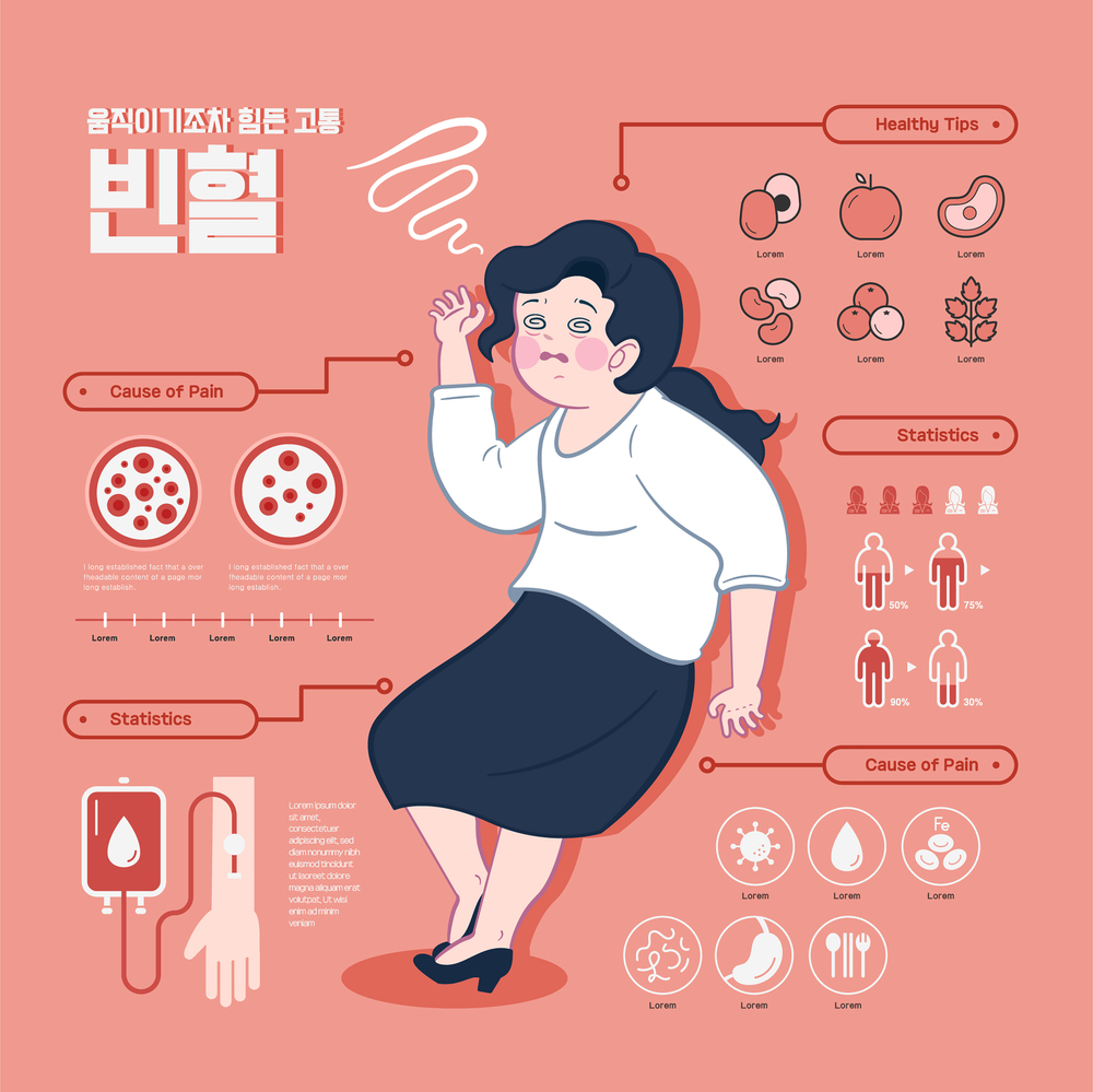 빈혈은 우리 몸의 적혈구가 부족하거나 헤모글로빈 수치가 낮아 산소를 효과적으로 운반할 수 없는 상태를 말합니다.