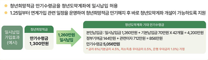 가입자의 상황에 따라 청년희망적금 만기액을 40, 50, 60, 70만원 배수로 자유롭게 설정하여 일시납입을 신청할 수 있습니다.