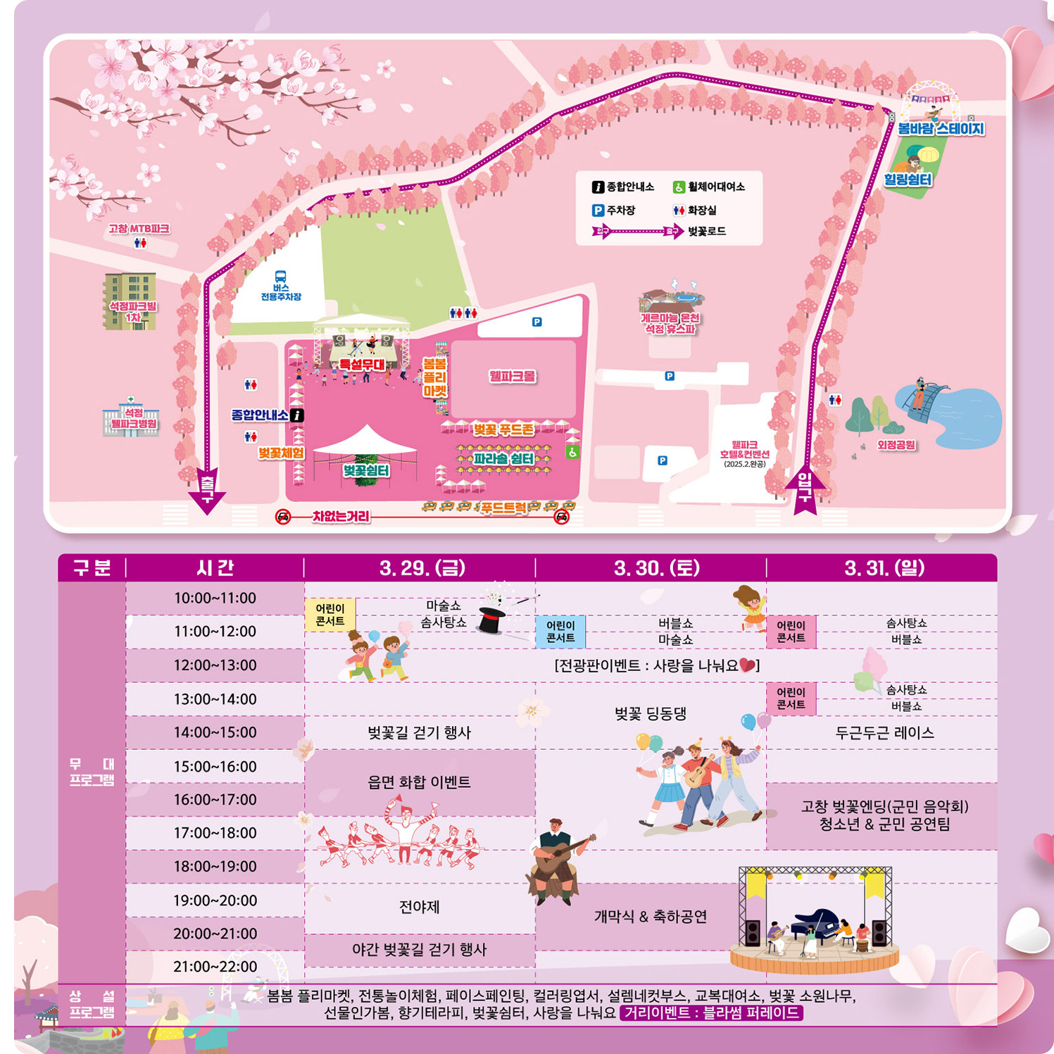 고창 벚꽃축제의 메인 프로그램은 다음과 같습니다. 축제의 서막을 알리는 전야제는 금요일 저녁 7시부터 8시까지 진행되며, 강예슬과 나상도가 출연합니다. 이어서 토요일 저녁 7시부터 8시 30분까지는 개막식이 열리며, 로이킴과 펀치가 무대를 장식할 예정입니다. 축제의 마무리는 '고창 벚꽃 엔딩'으로, 고창의 청소년 및 군민 공연팀이 아름다운 벚꽃 아래에서 감동적인 무대를 선보일 것입니다