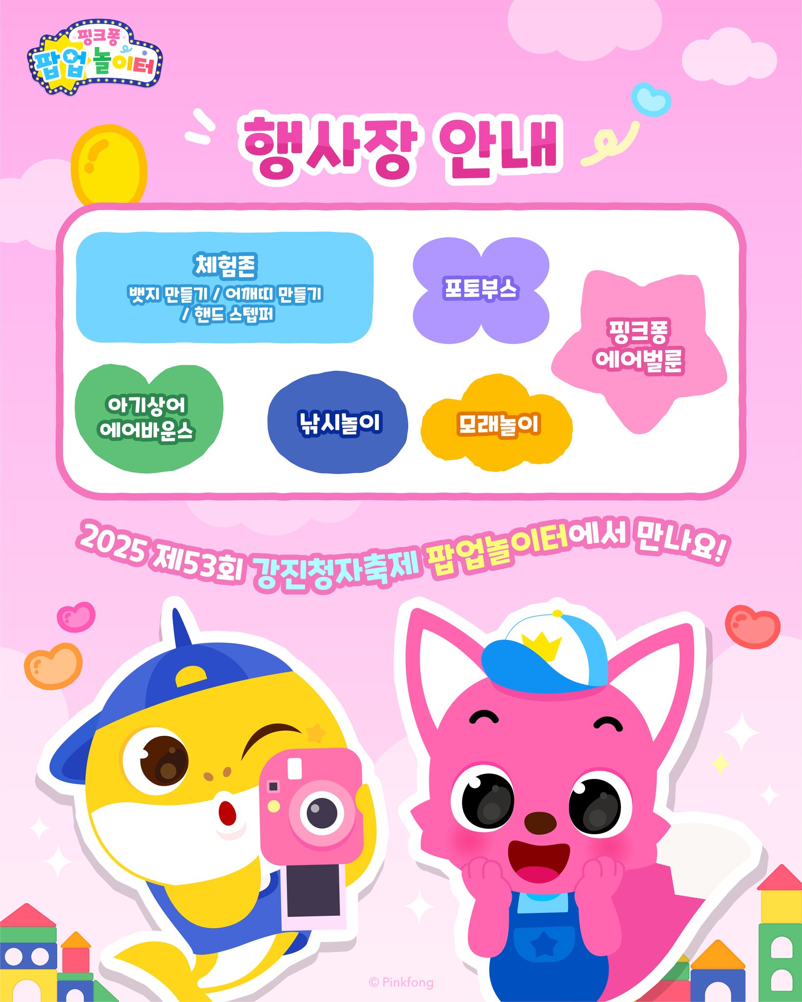 - 어린이를 위한 핑크퐁 팝업놀이터: 9M 핑크퐁 대형 에어벌룬과 함께 사진을 찍고, 아기상어 에어바운스에서 신나게 놀 수 있어요! 다양한 DIY 체험, 모래놀이, 낚시놀이까지 준비되어 있으며, 3월 2일에는 '베베핀 해피콘서트' 공연도 놓치지 마세요