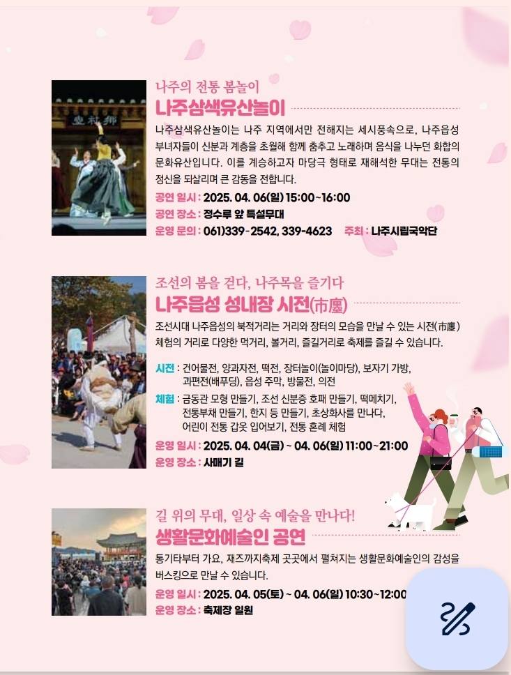 금성관과 사대성문 사이, 천년 문화유산이 살아 숨 쉬는 나주목에서 흥과 해학이 어우러진 조선시대 봄나들이가 펼쳐집니다. 시전 체험부터 공연, 전통놀이까지 조선의 봄 풍경을 오늘의 나주에서 만날 수 있는 특별한 시간! 찬란한 봄꽃 향기 따라 올봄, 가장 나주다운 봄을 만나보세요.
