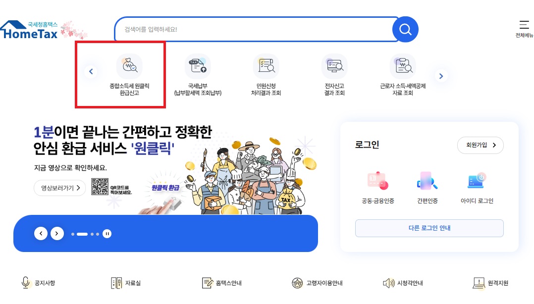 홈택스 접속 👉 ‘원클릭 환급 신고’ 클릭 👉 간편 인증 로그인 👉 환급금 확인 👉 ‘이대로 신고하기’ 클릭!