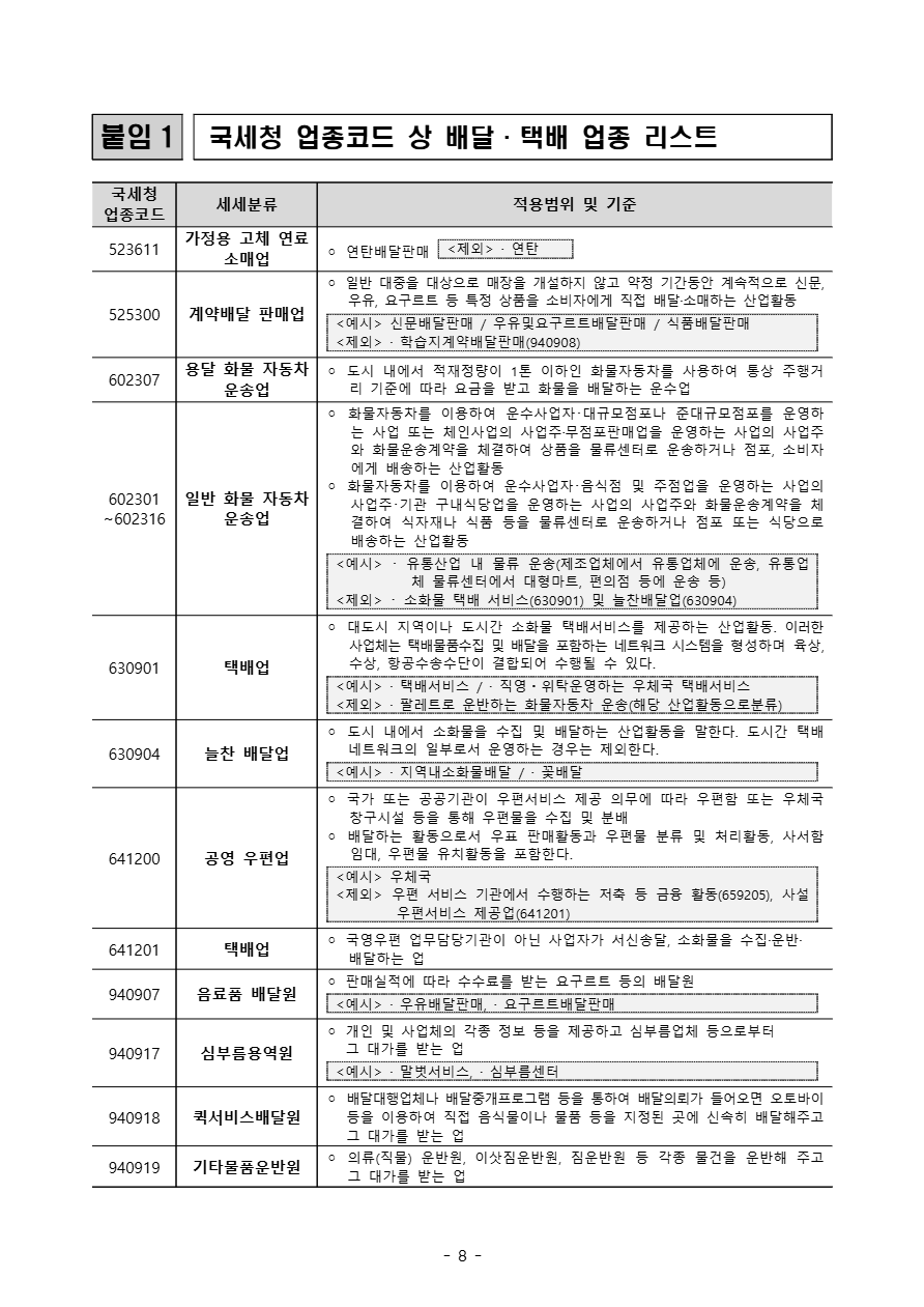 - 위에 해당하지 않는 모든 배달앱, 퀵서비스, 심부름센터, 직접배달 업체