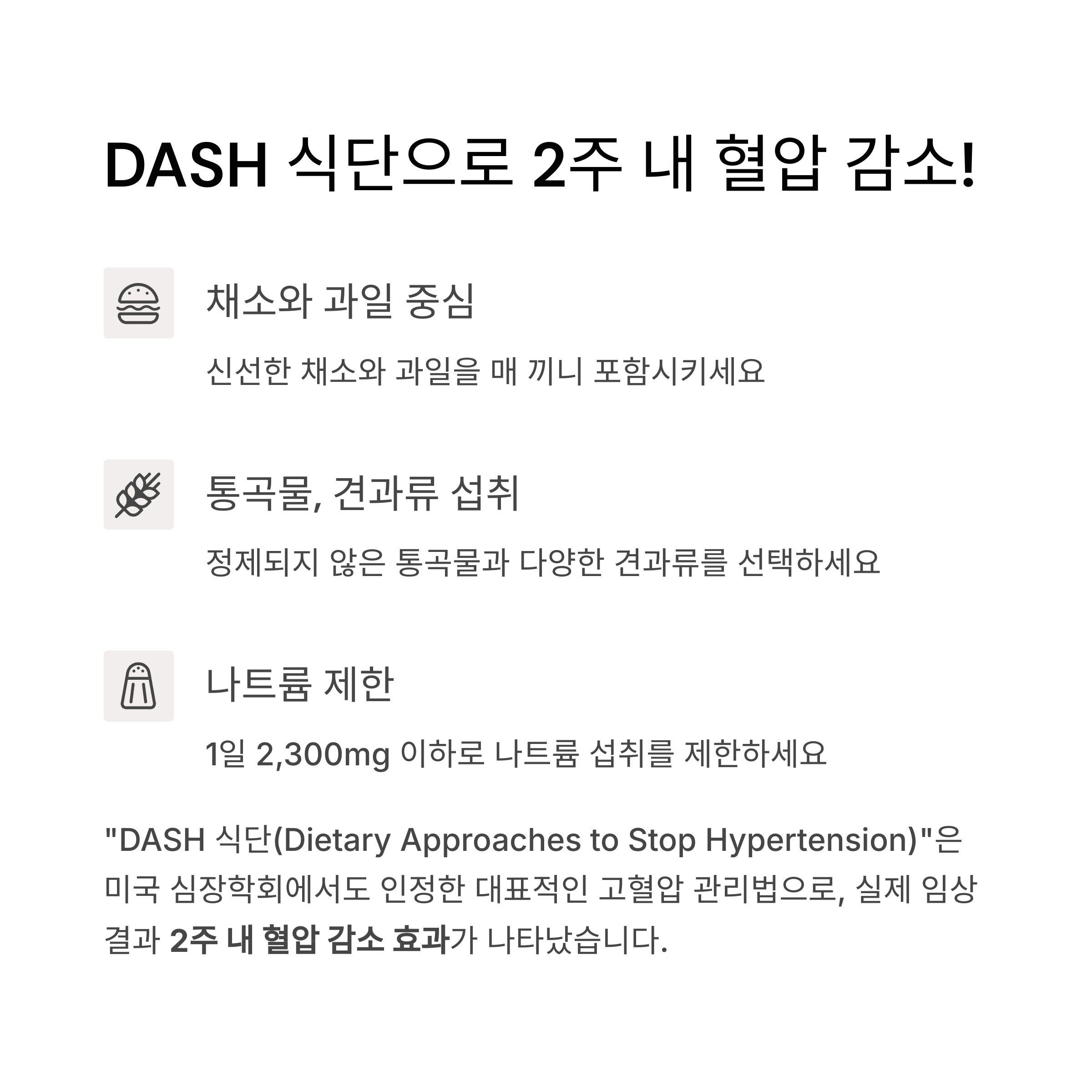 • 실천: 매일 30분 걷기 + DASH 식단 + 스트레스 관리