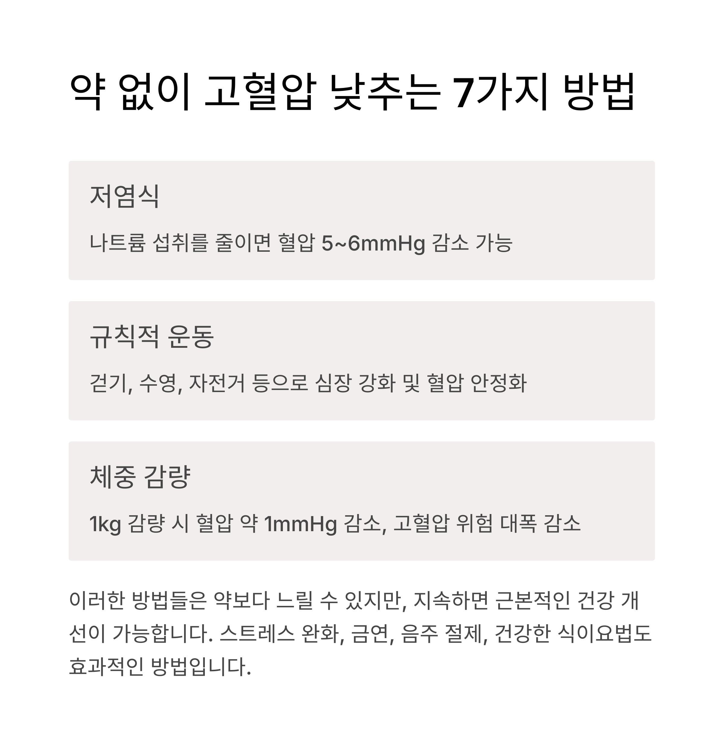 | 체중 감량 | 1kg 감량 시 혈압 약 1mmHg 감소 | 고혈압 위험 대폭 감소 |