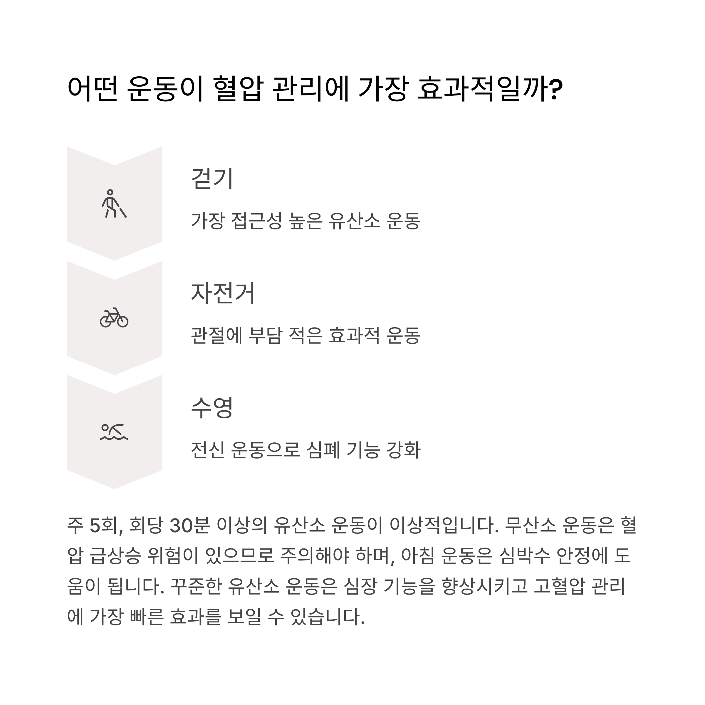 | 규칙적 운동 | 걷기, 수영, 자전거 등 | 심장 강화 및 혈압 안정화 |