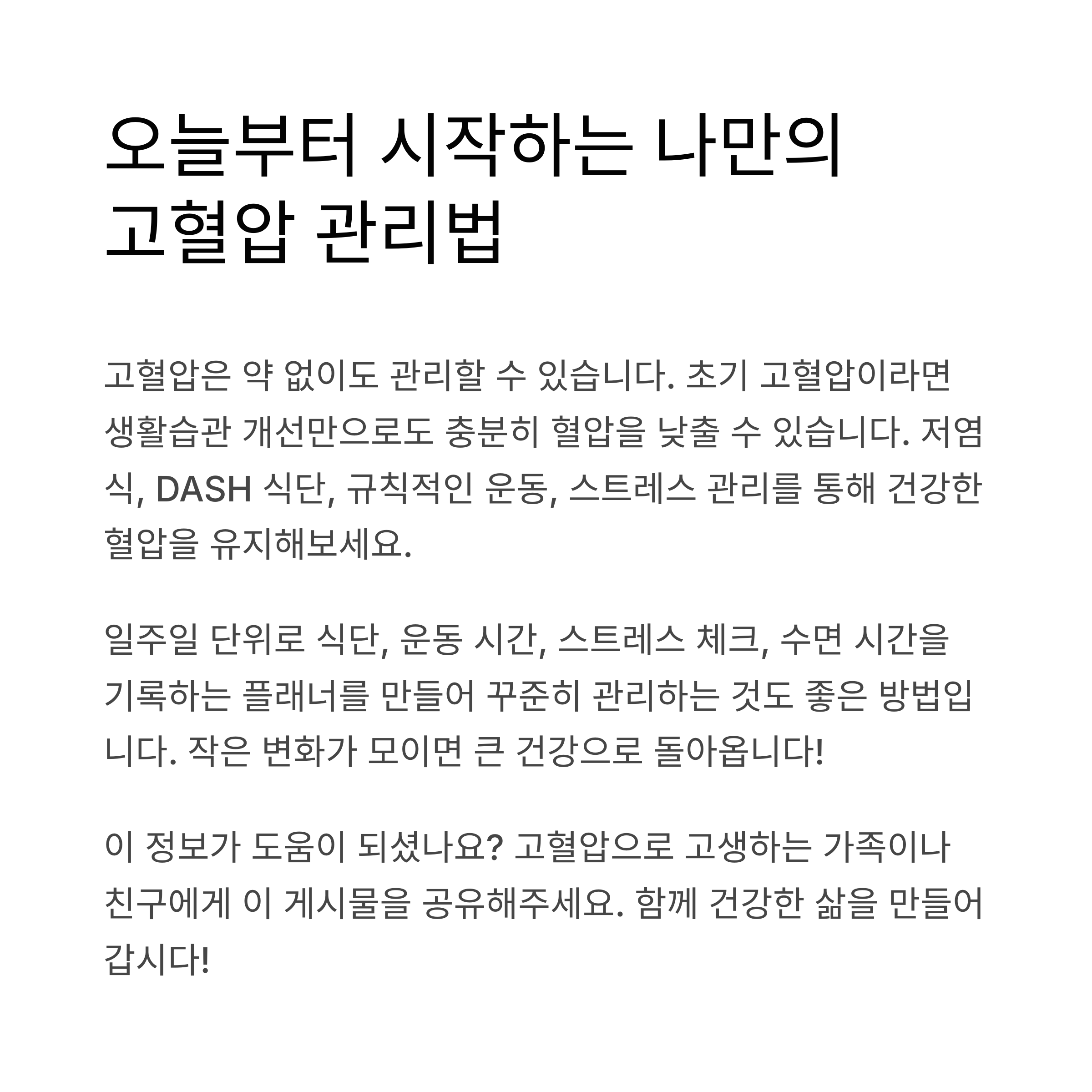 - 실천: 매일 30분 걷기 + DASH 식단 + 스트레스 관리