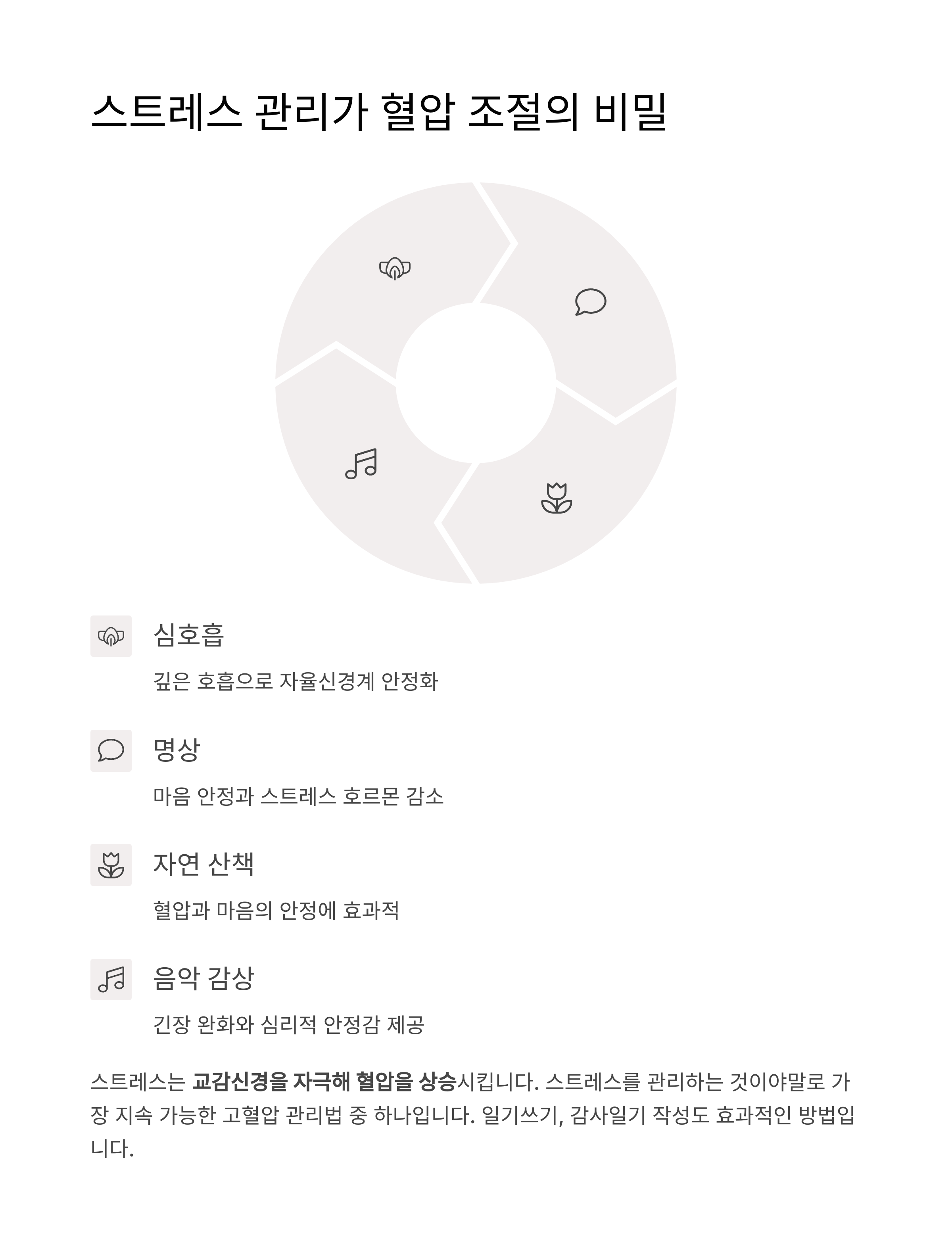 | 스트레스 완화 | 명상, 요가, 호흡법 | 긴장 완화로 혈압 낮춤 |