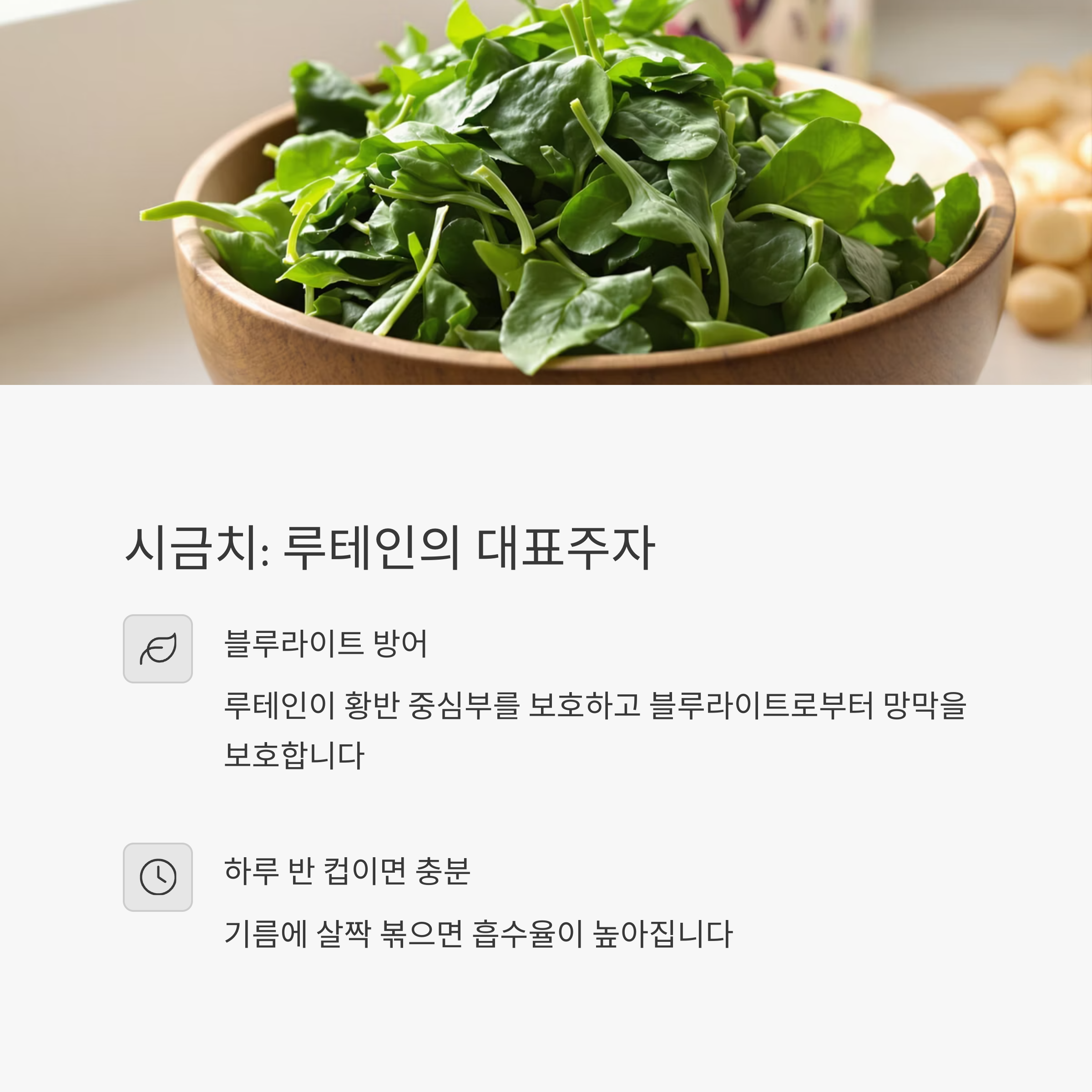 "시금치는 루테인과 제아잔틴 함량이 높은 대표적인 녹황색 채소입니다."