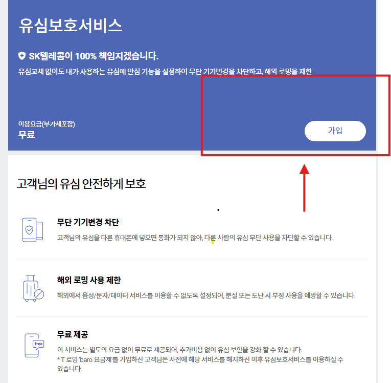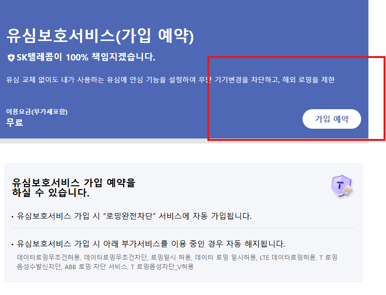 - T월드 앱 또는 홈페이지: 검색창에 '유심보호서비스' 입력 후 해당 서비스 페이지에서 '가입' 버튼을 클릭합니다.