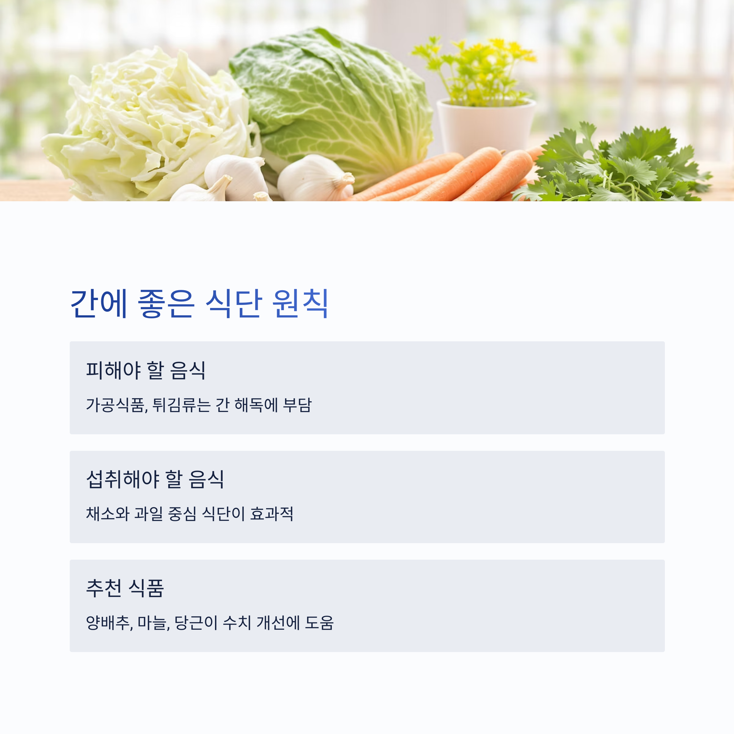 | 양배추 | 해독 효소 활성화 → 수치 완화 |