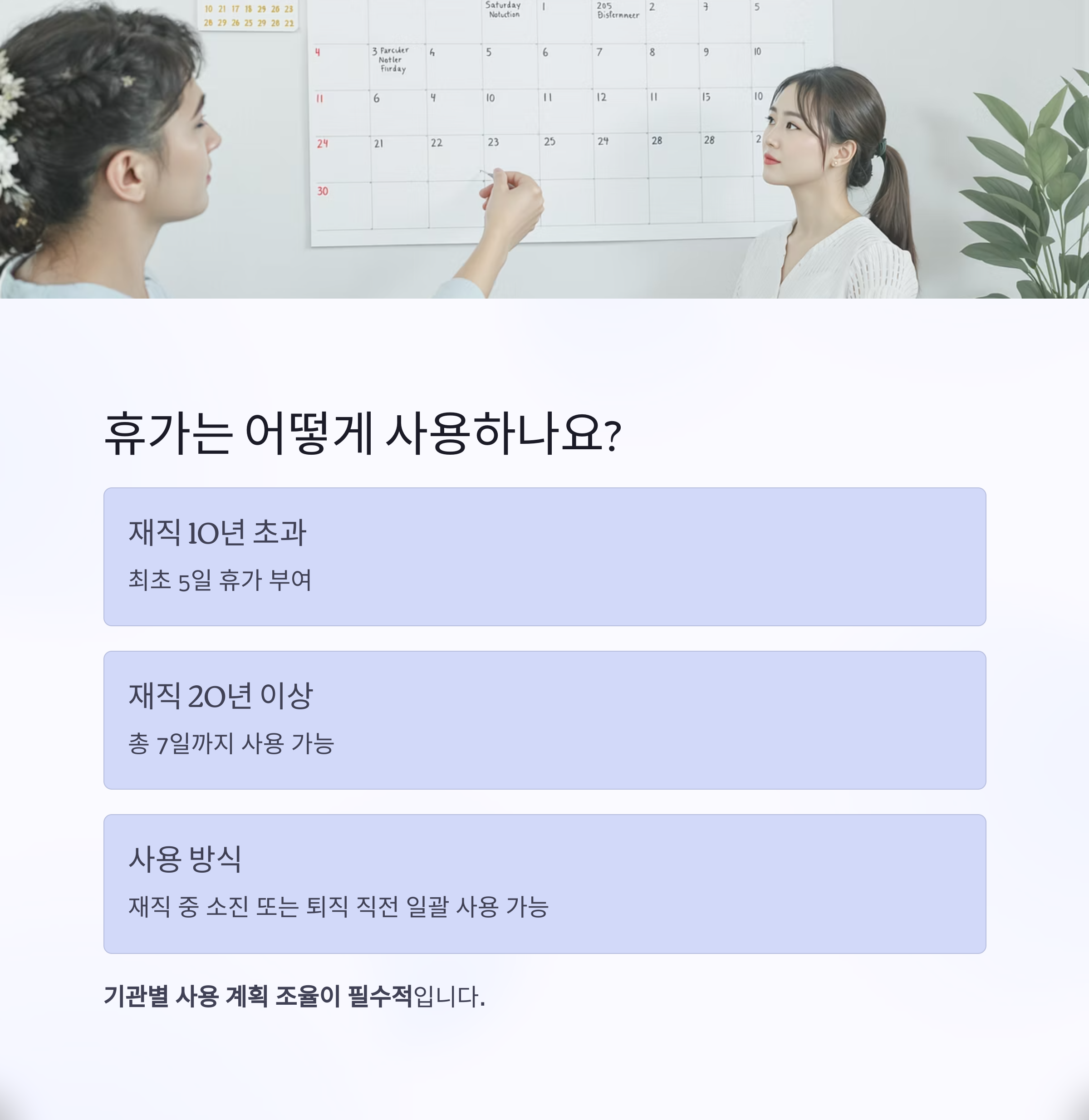 재직기간 10년을 초과할 경우 최초 5일의 휴가를 부여받고, 20년 이상일 경우 총 7일까지 사용 가능하다는 점입니다.