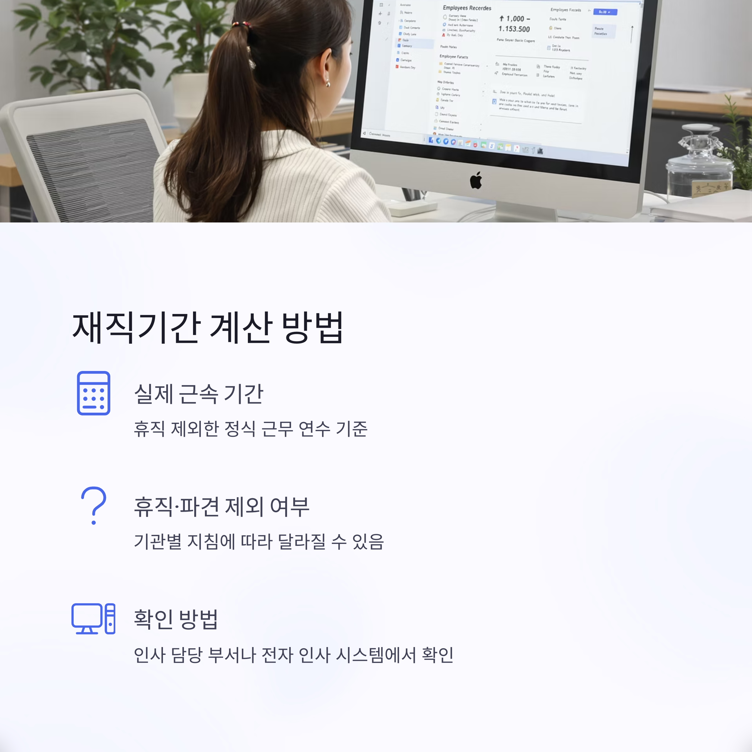 공무원 재직기간 중 실제 근속 기간(휴직 제외 등) 을 기반으로 산정됩니다.
