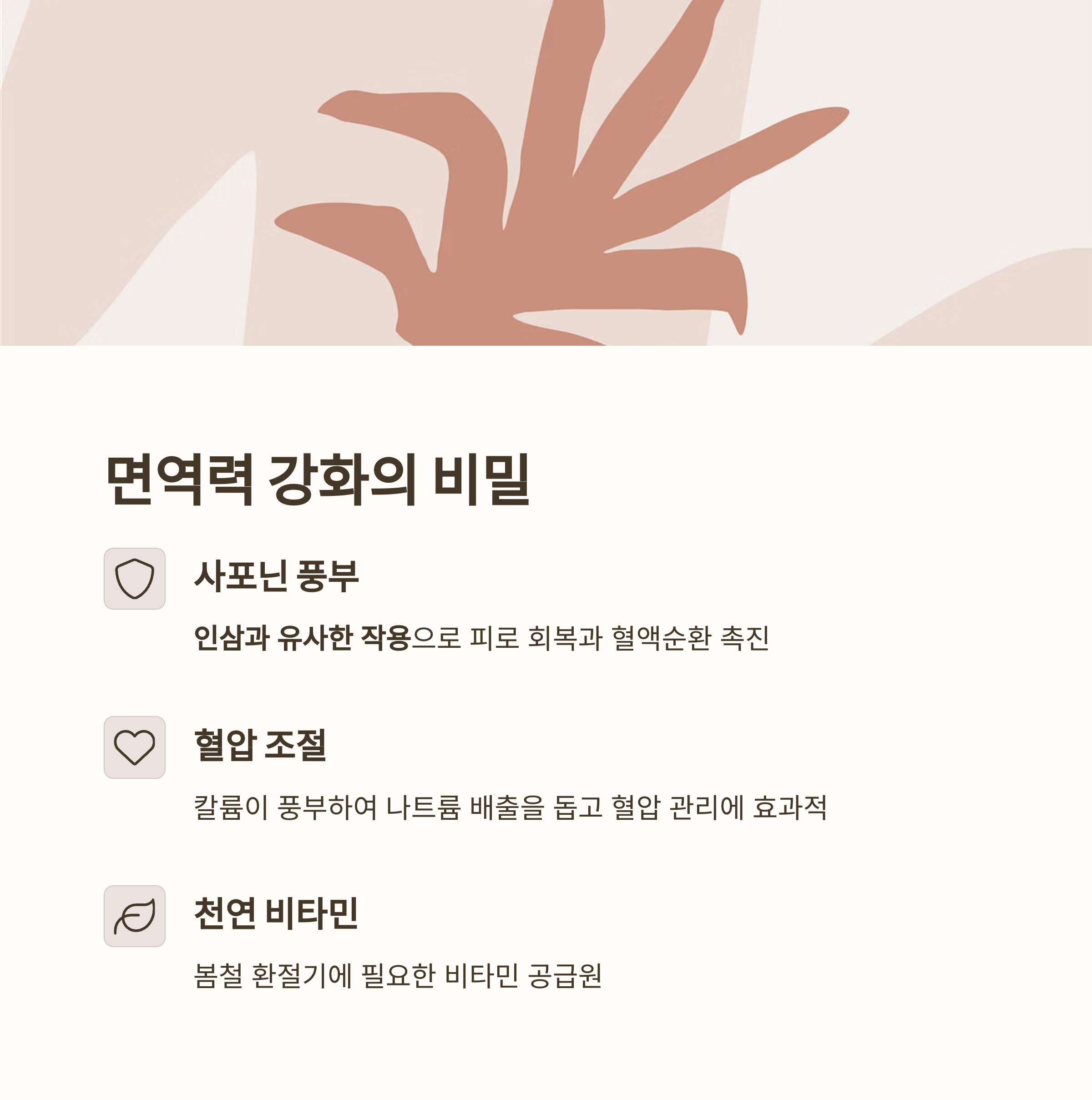 쌉쌀한 맛 뒤에 숨어 있는 풍부한 영양소는 면역력 향상과 피로 회복에 탁월한 효과를 줍니다.