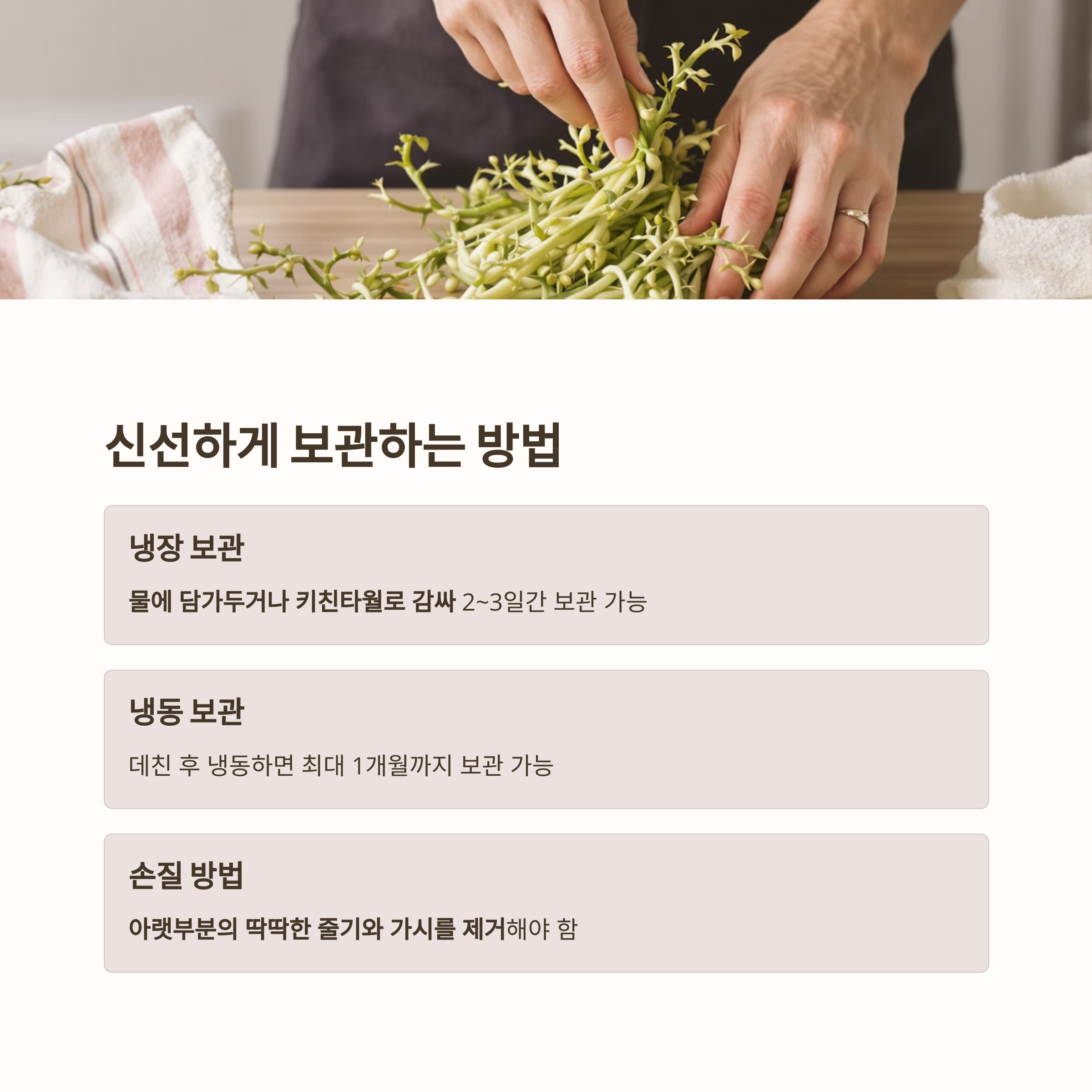 | 데친 후 냉동 | 최대 1개월 | 향 손실 주의 |