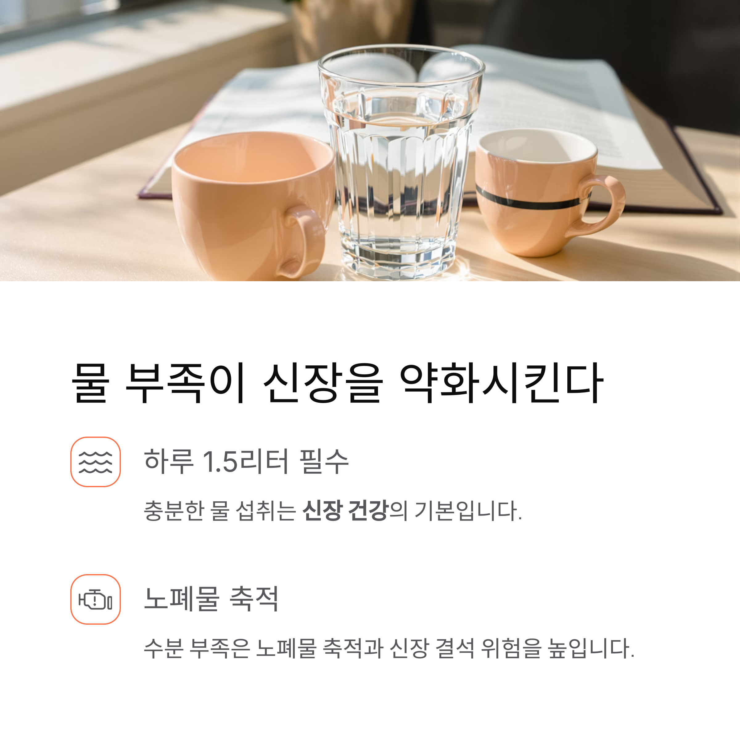 "하루 두 잔 물도 힘들다"는 생각은 이제 그만, 신장 건강을 위해 지금이라도 시작하세요.