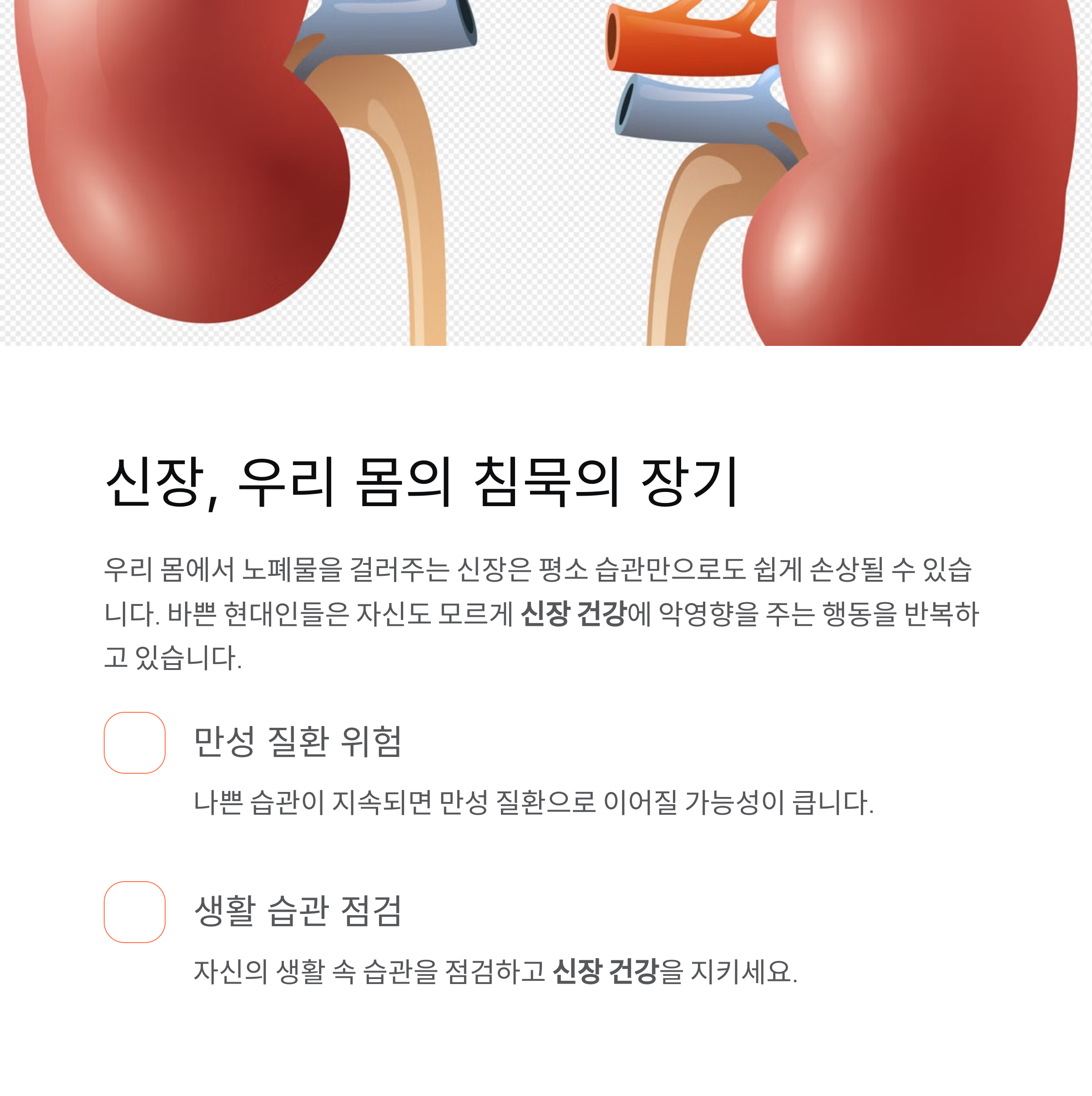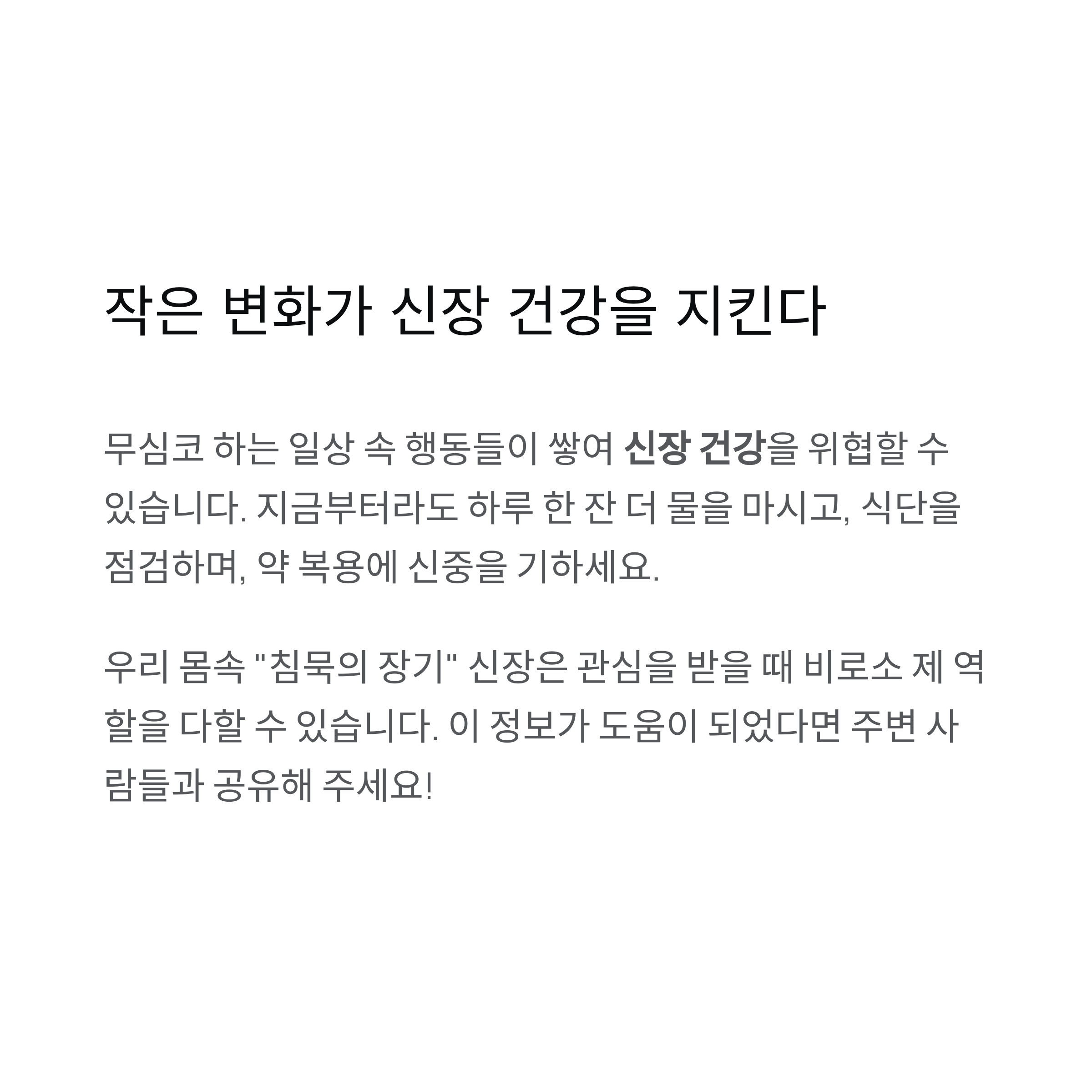 조금의 관심과 꾸준한 실천만으로도 충분히 신장 건강을 지킬 수 있습니다.