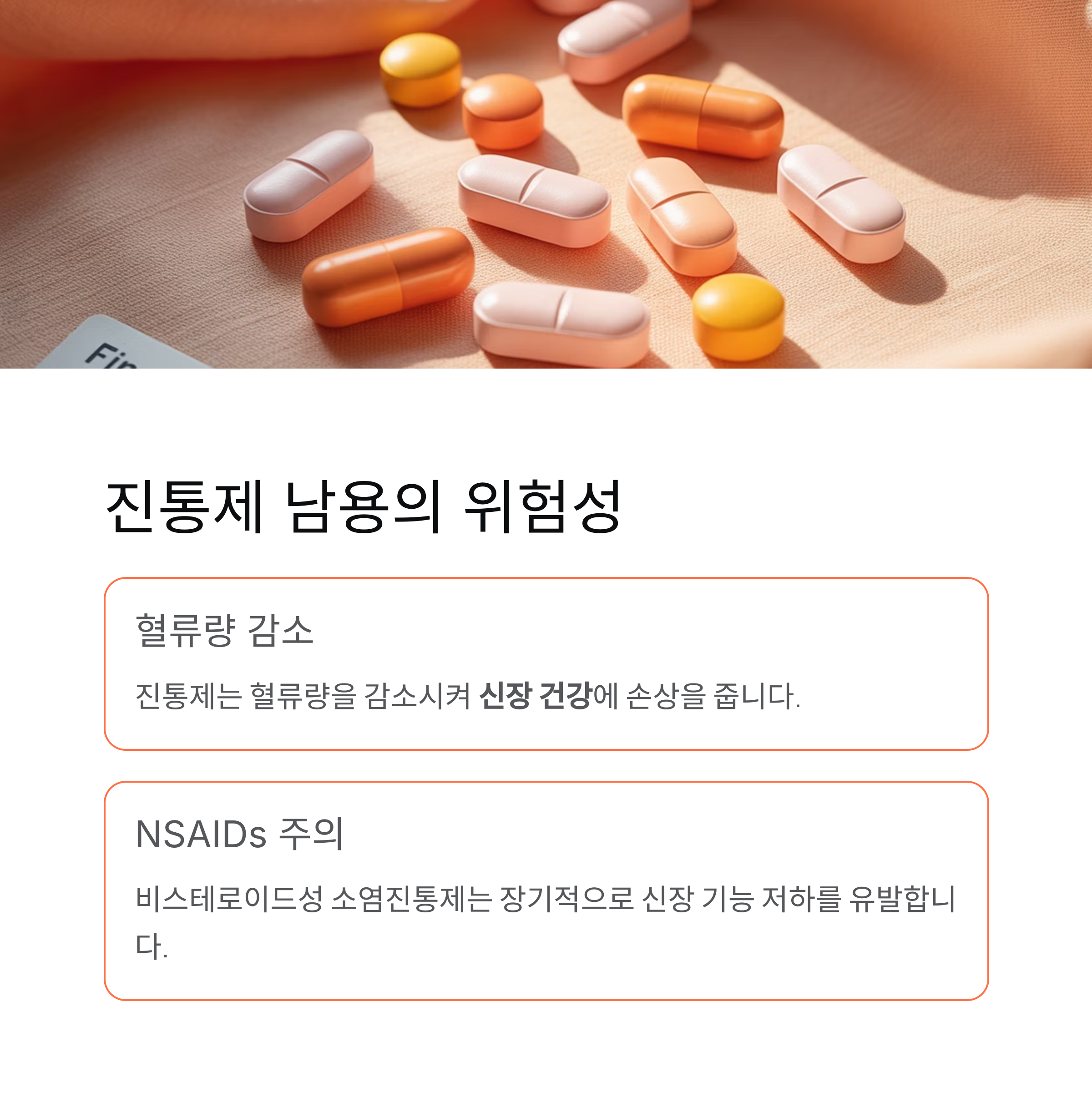 특히 비스테로이드성 소염진통제(NSAIDs)를 자주 복용하는 경우 장기적으로 신장 기능 저하를 유발할 수 있습니다.