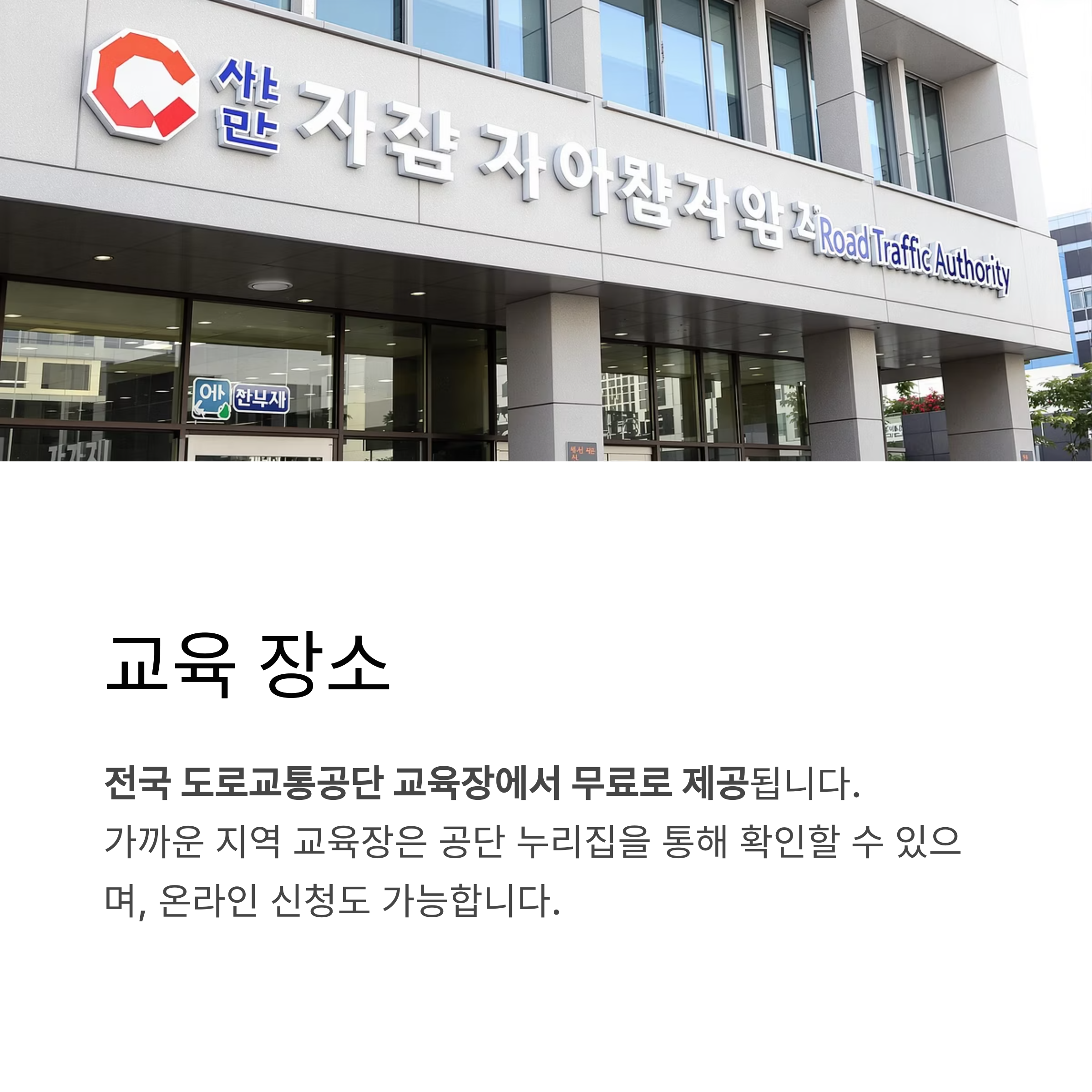 고령운전자 교통안전교육은 전국 도로교통공단 교육장에서 무료로 제공됩니다.