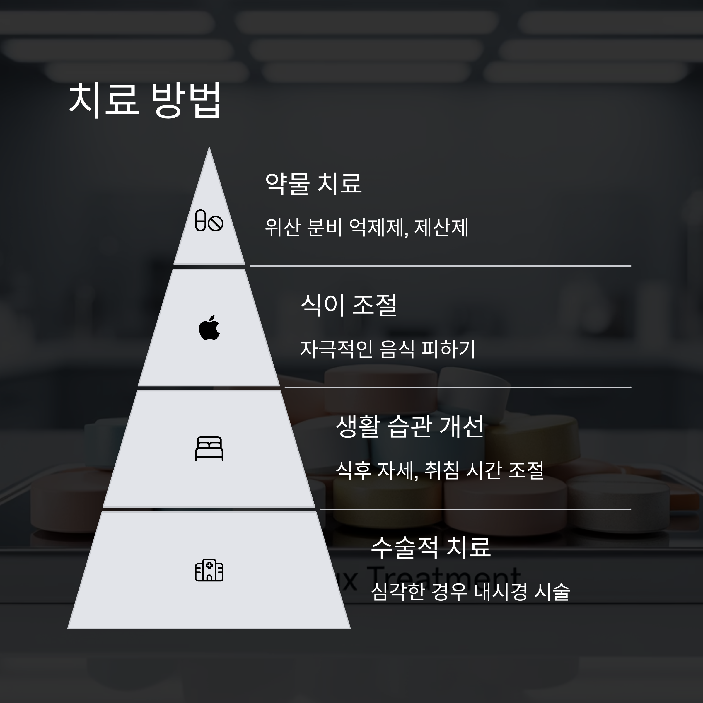 약물치료가 가장 일반적이며, **위산 분비 억제제(PPI)**나 제산제를 복용하는 경우가 많아요.