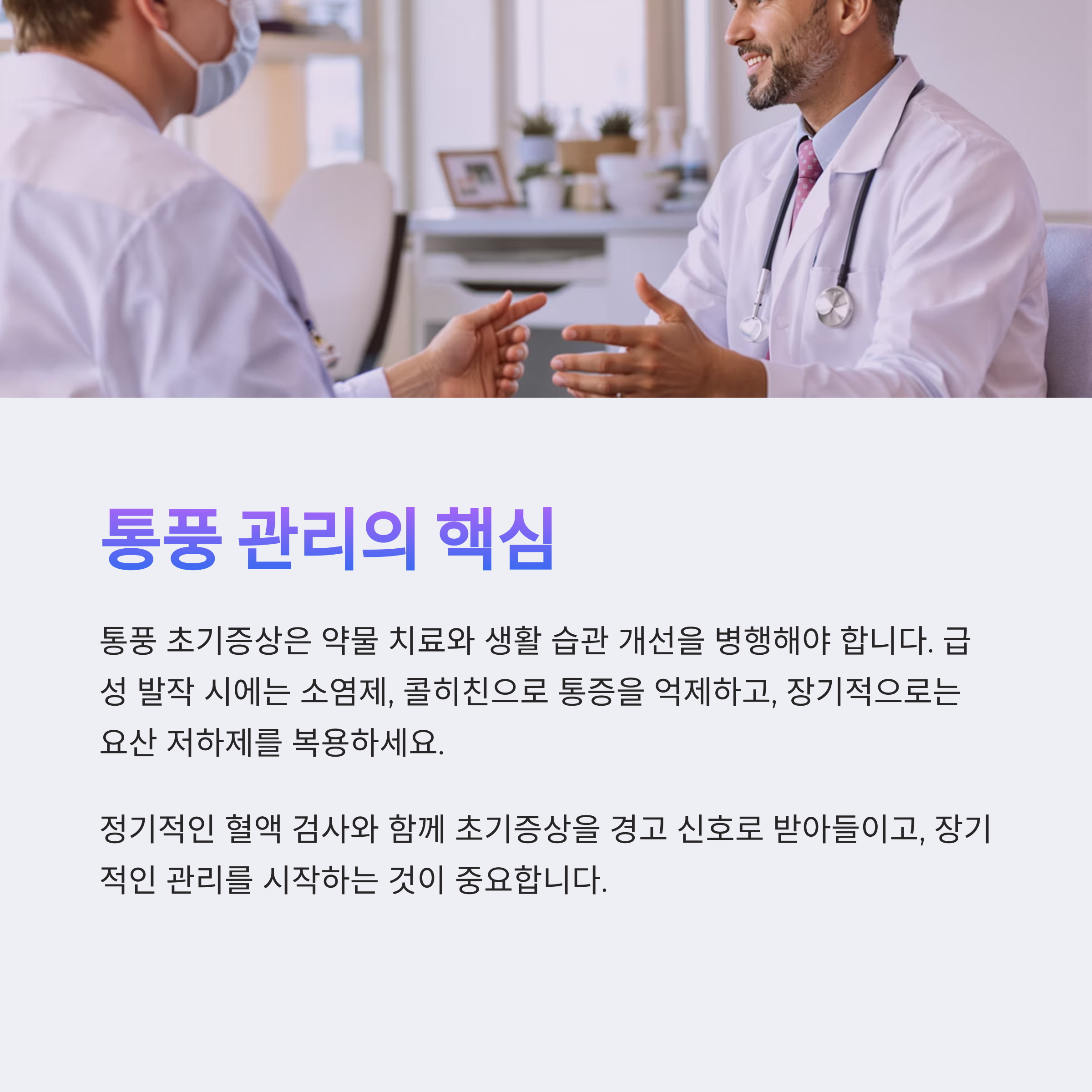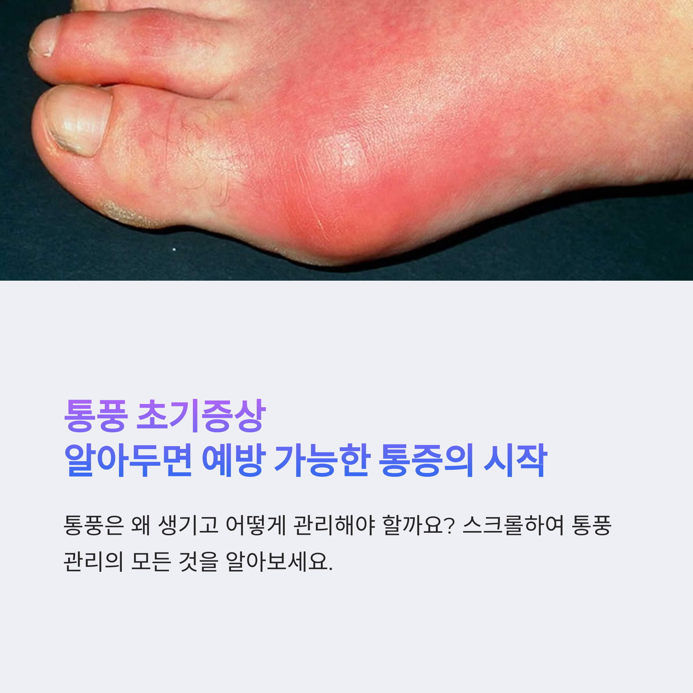 "통풍 초기증상은 단순 관절염으로 오인되기 쉬우므로 조기 진단이 중요합니다."