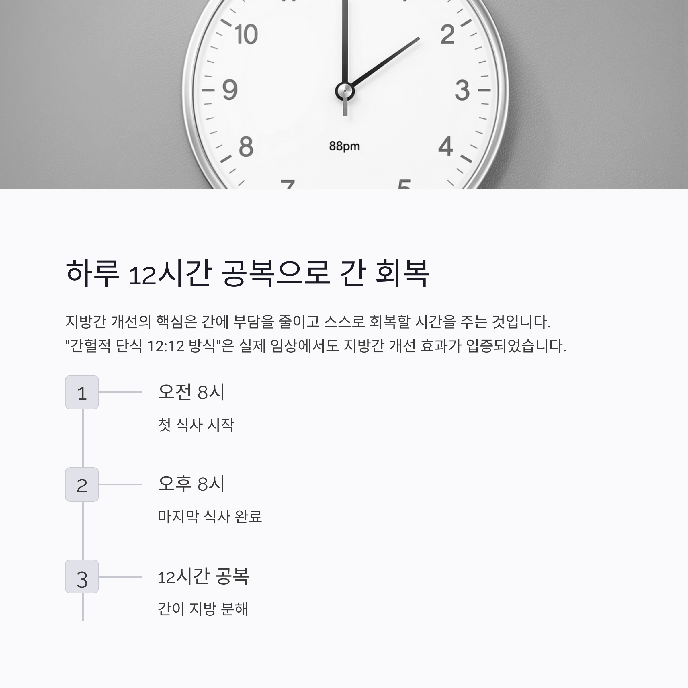 "간헐적 단식 12:12 방식"은 실제 임상에서도 지방간 개선 효과가 입증된 방식입니다.