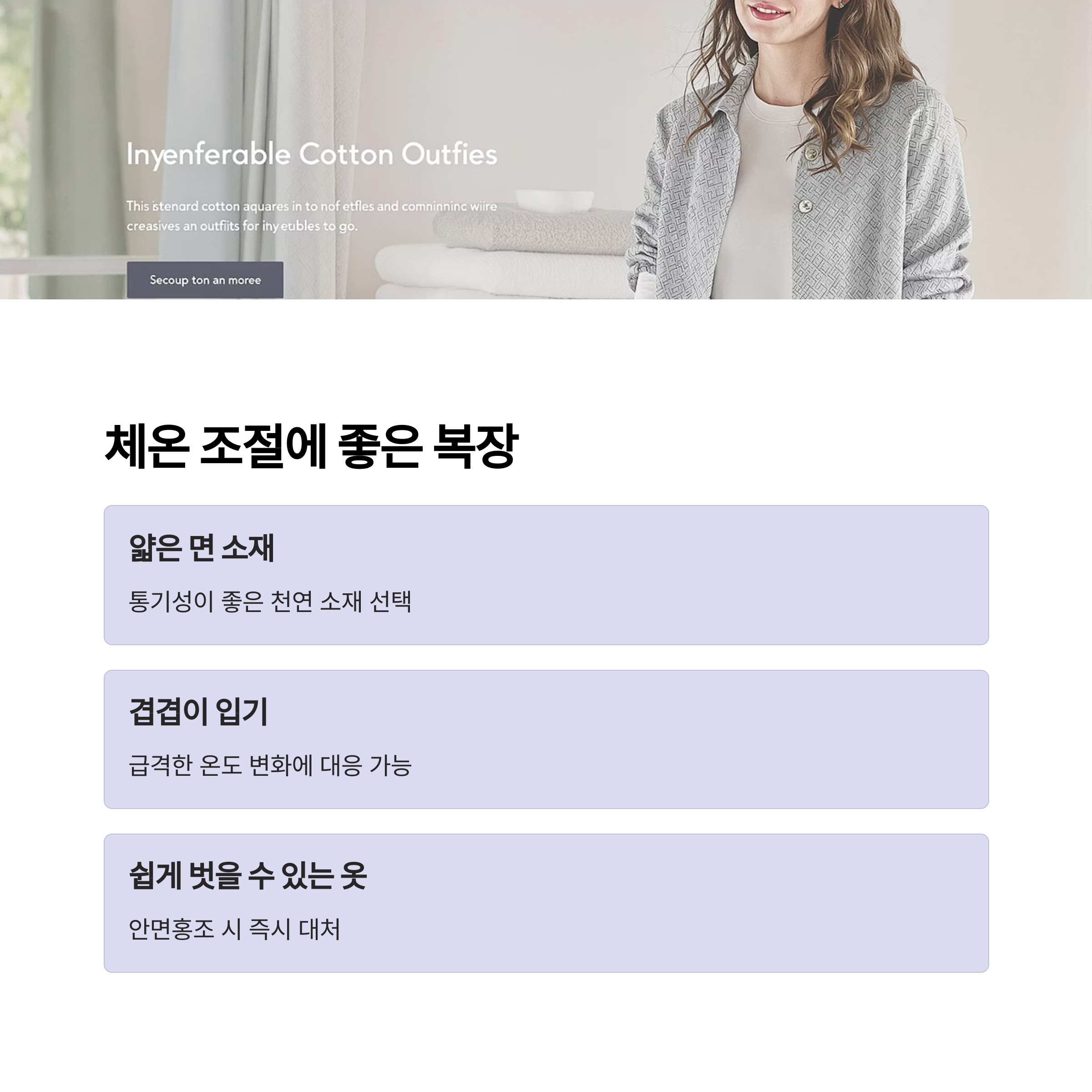갱년기 대표 증상인 안면홍조와 발한은 체온 조절 능력의 저하에서 비롯됩니다. 얇고 통기성이 좋은 면 소재 옷을 겹겹이 입는 것이 도움이 됩니다.