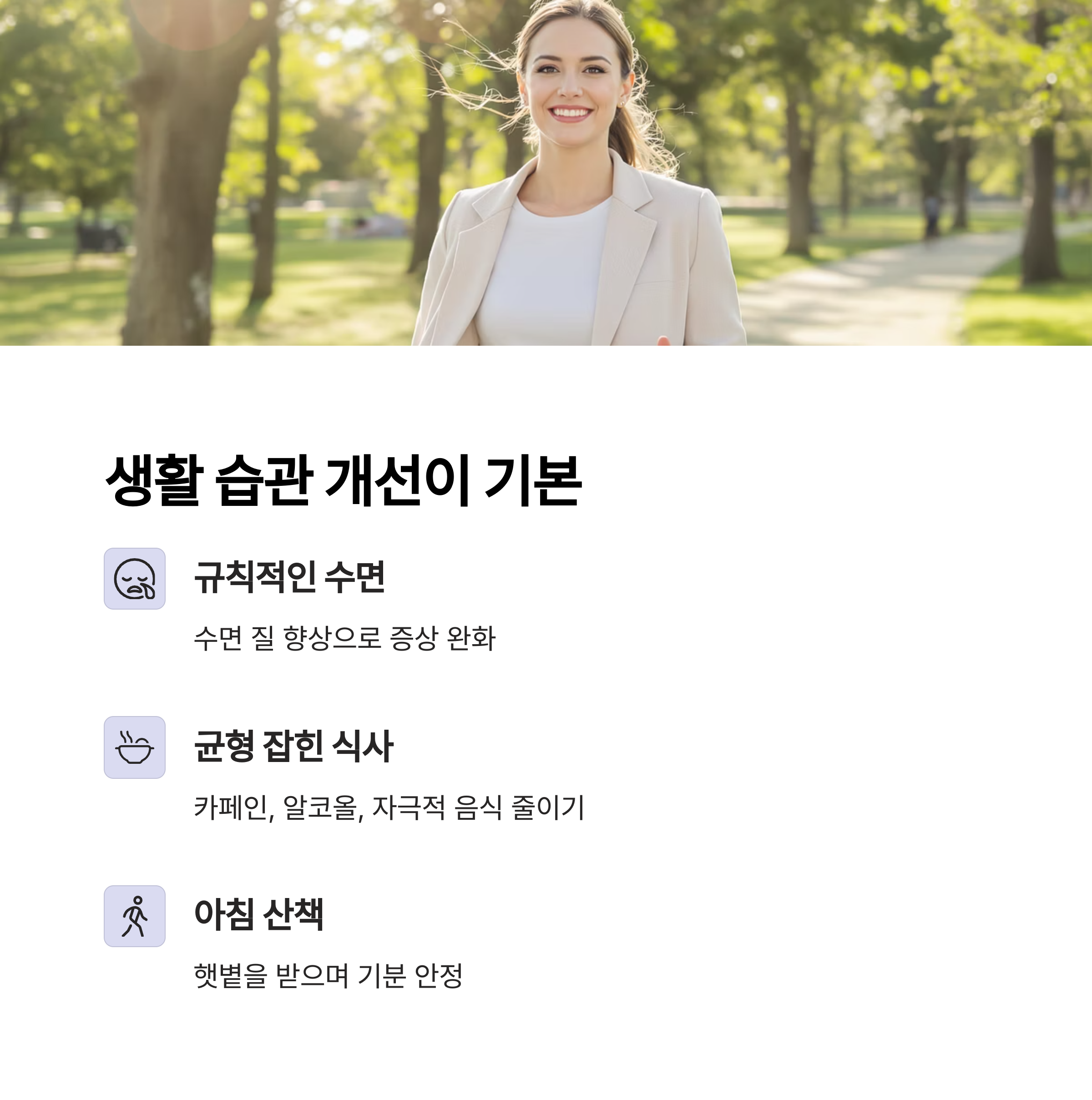 "처음엔 약을 찾았지만, 매일 산책하고 두유를 챙겨 먹으면서 점차 증상이 줄었어요.