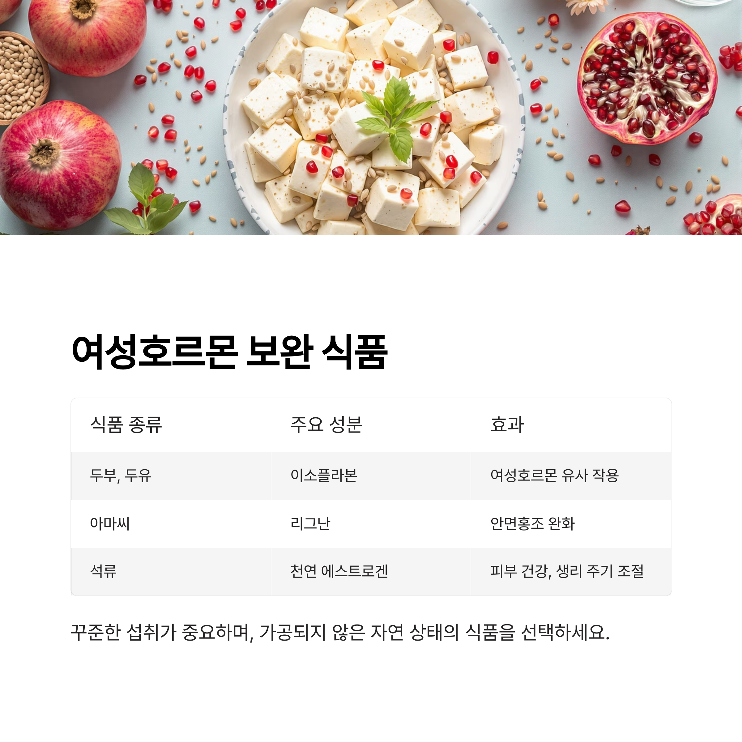 | 석류 | 천연 에스트로겐 | 피부 건강, 생리 주기 조절 |