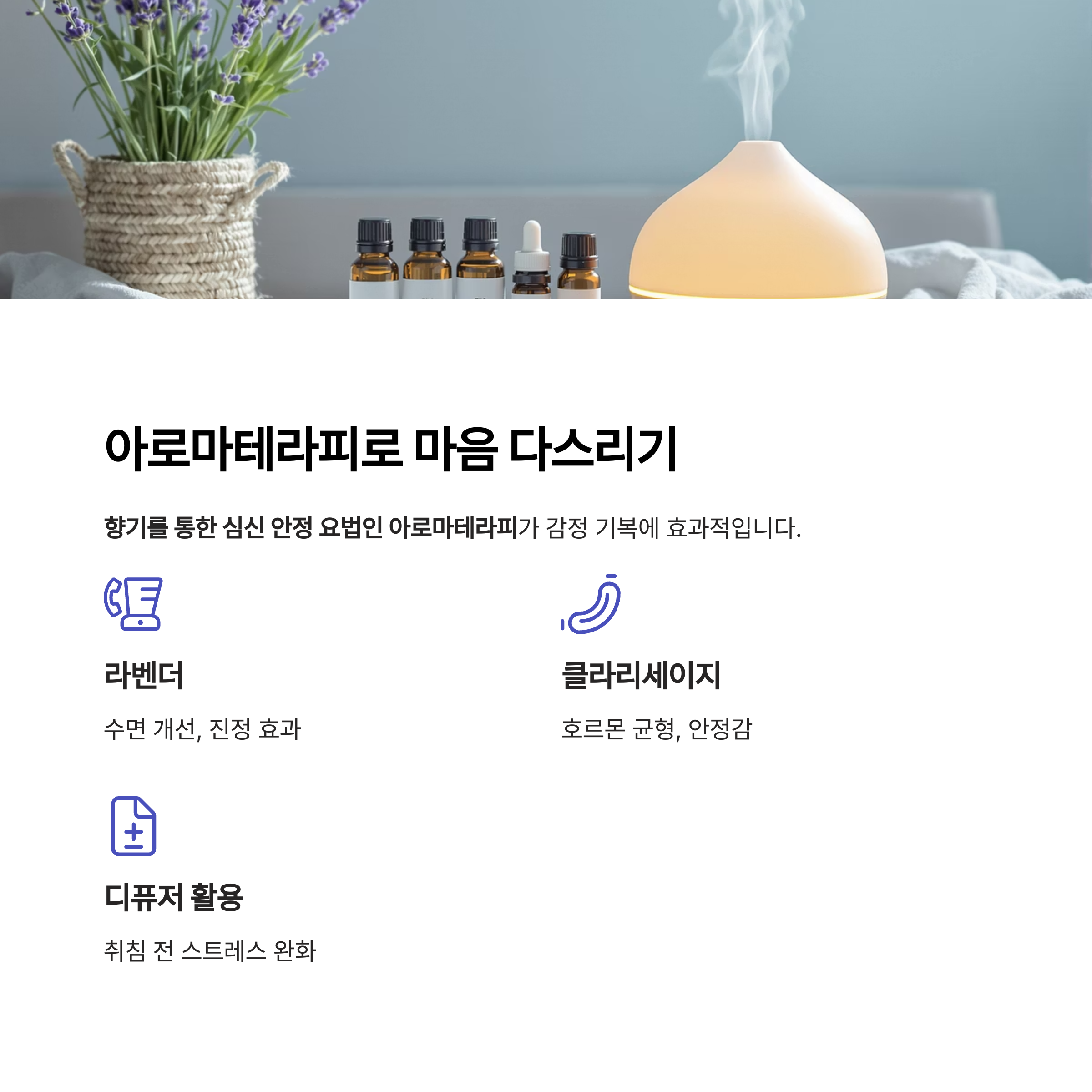 "밤에 아로마 디퓨저를 틀어두면 수면의 질이 향상되고, 하루의 스트레스도 완화됩니다."