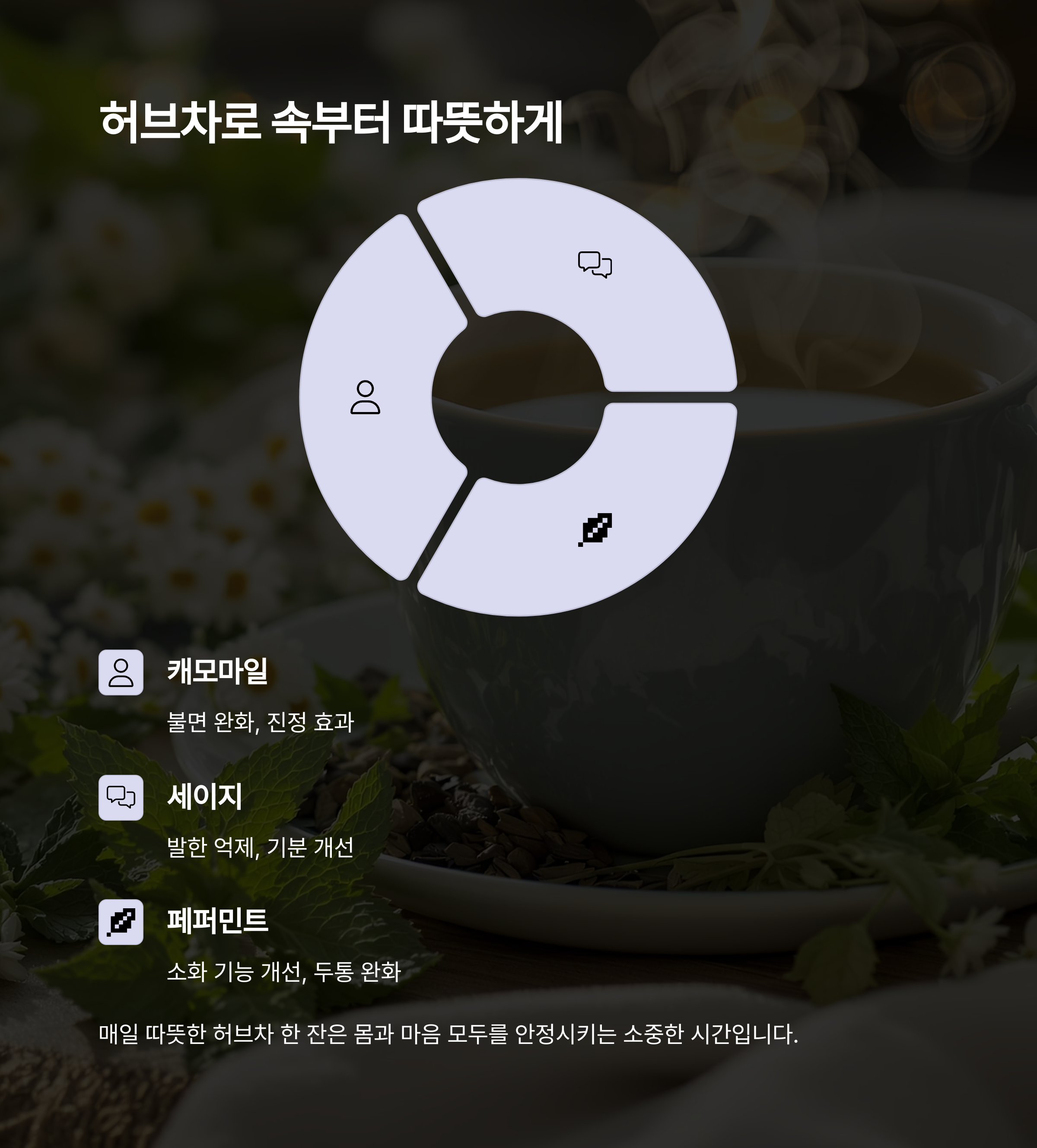 허브차는 몸을 따뜻하게 하고, 불안을 진정시키는 데 탁월합니다.