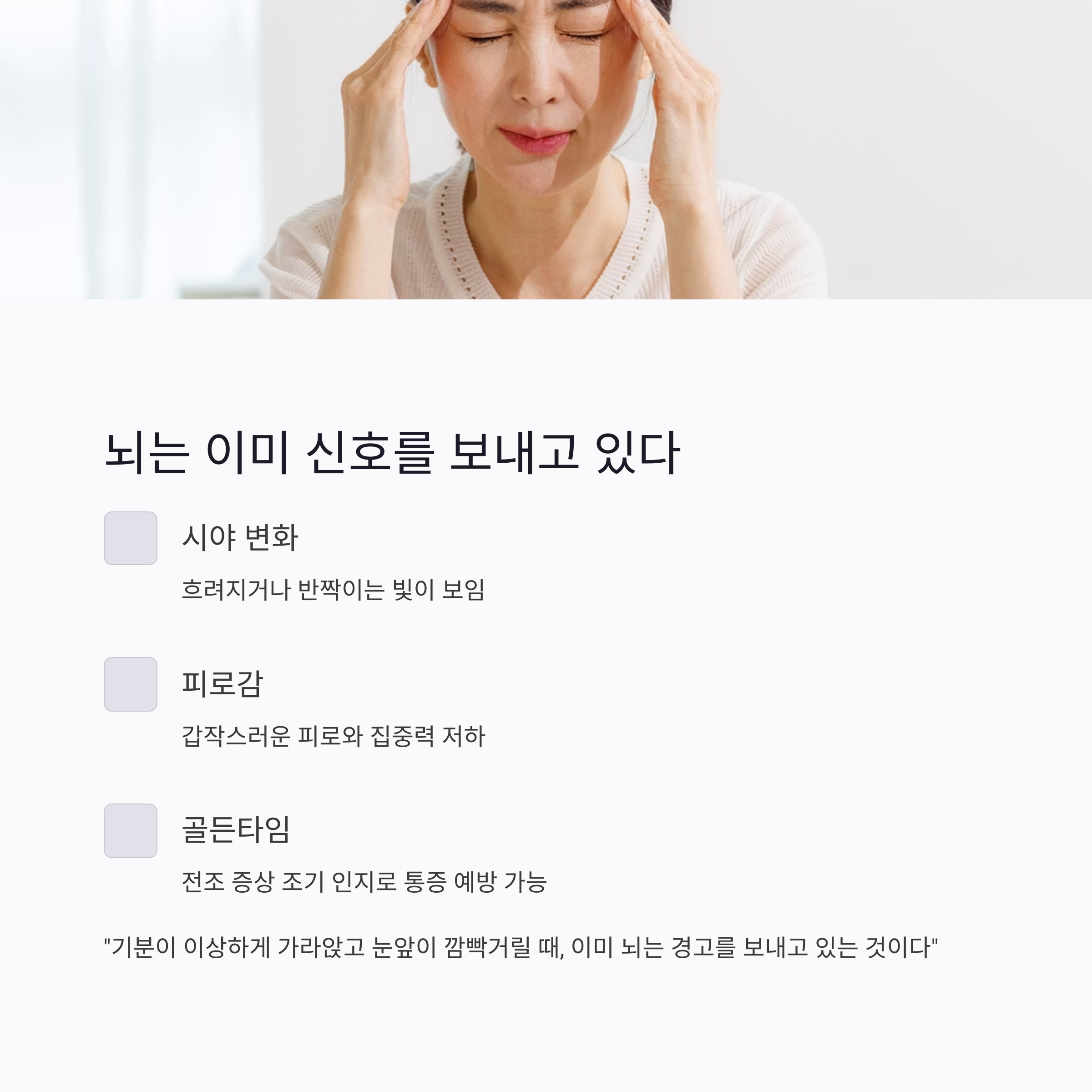 이러한 변화는 편두통의 전조 증상으로, **조기 인지만으로도 통증을 막을 수 있는 '골든타임'**이 생깁니다.